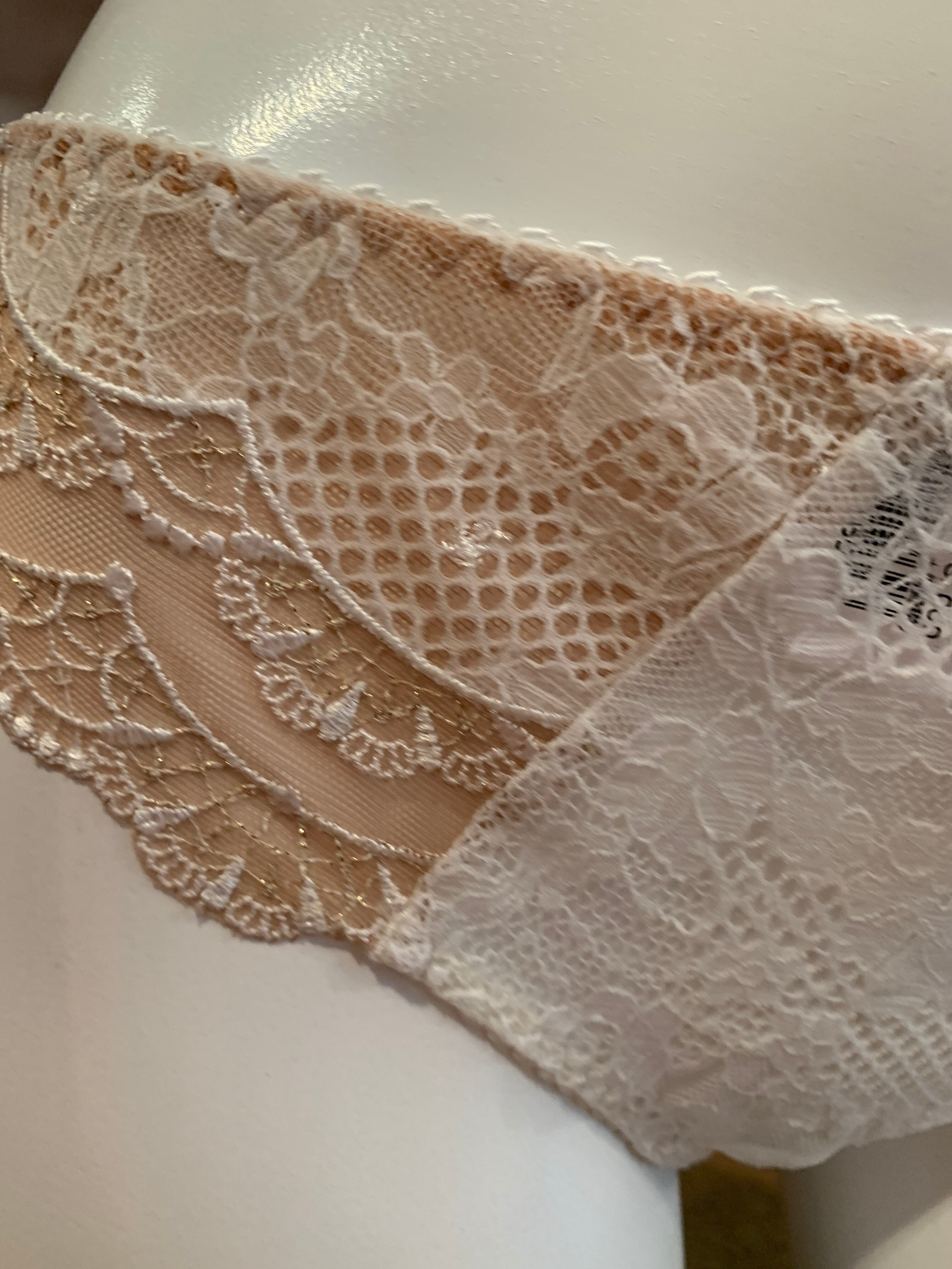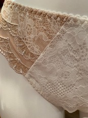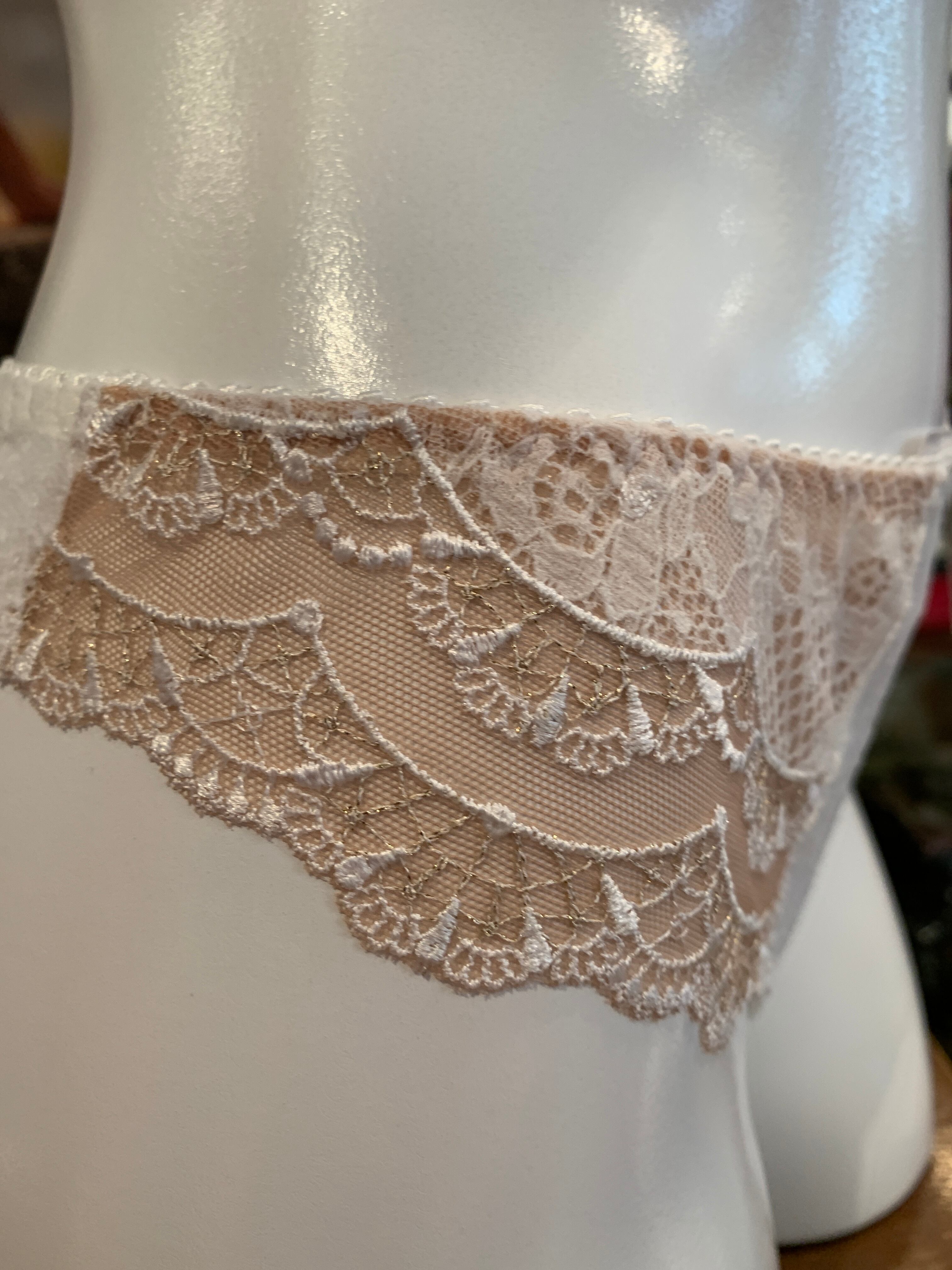 パールカラーのヒップを華やかに彩るゴージャスなレースを配しバックはヒップの曲線美がとても魅惑的な効果を発揮します。