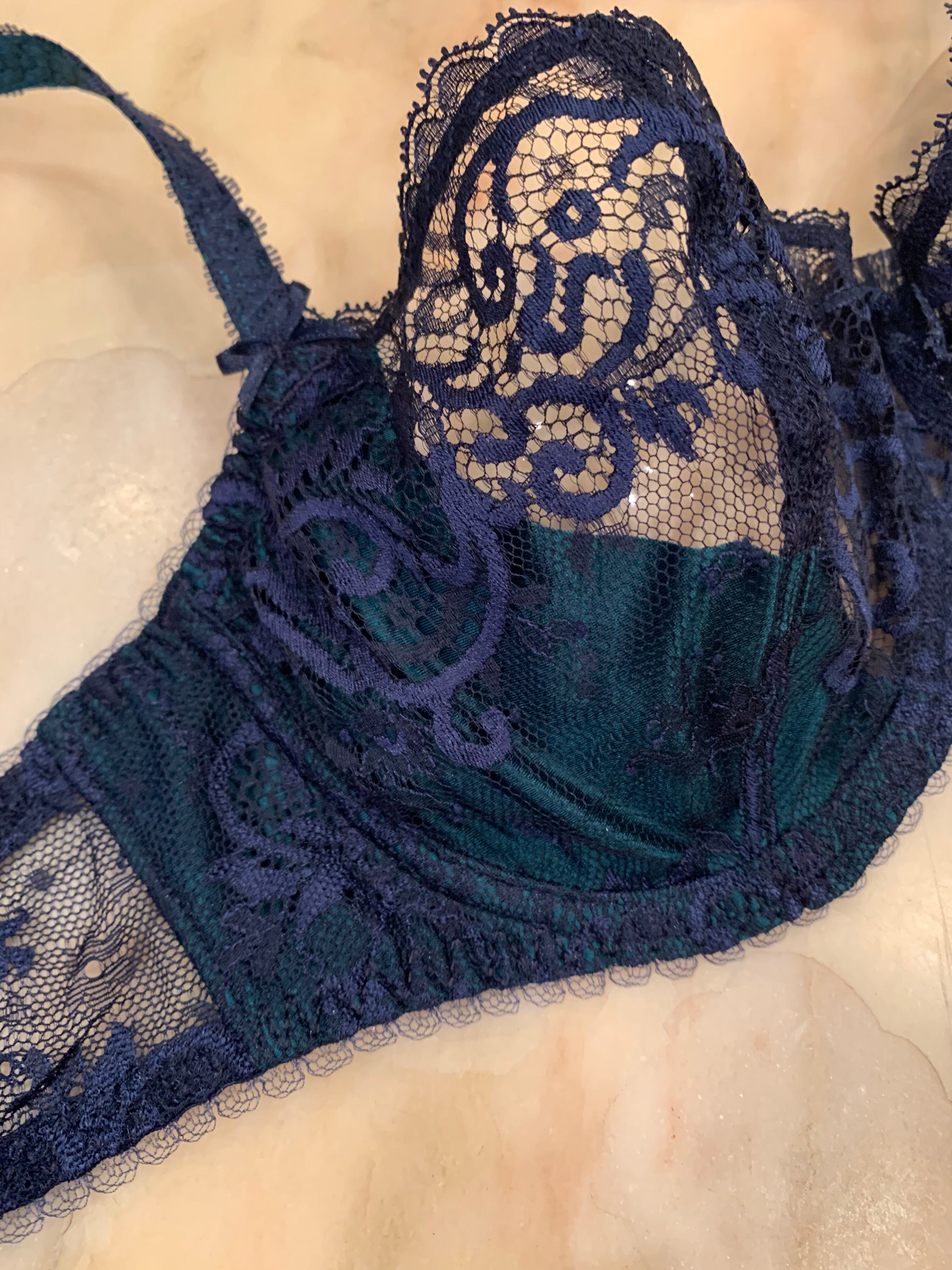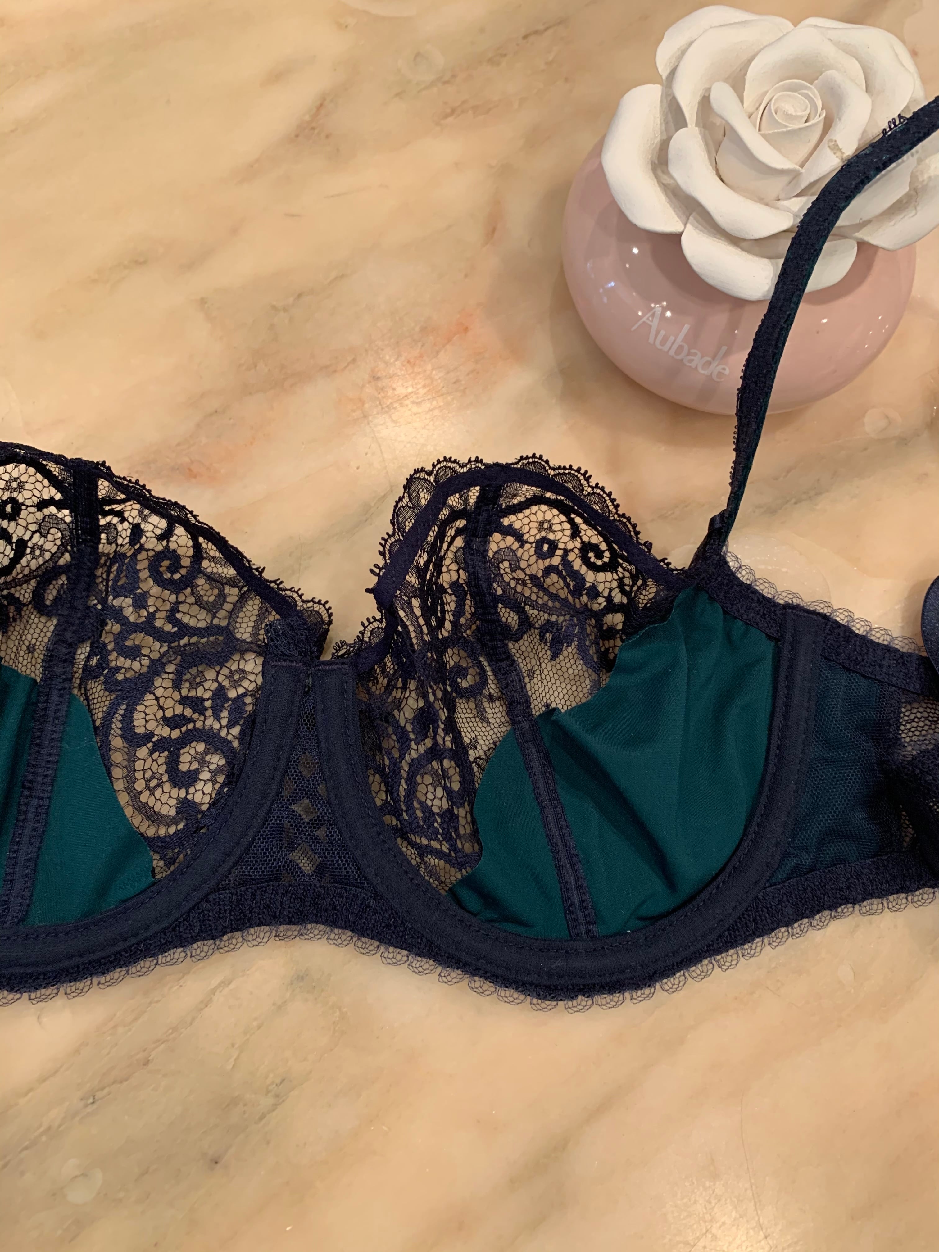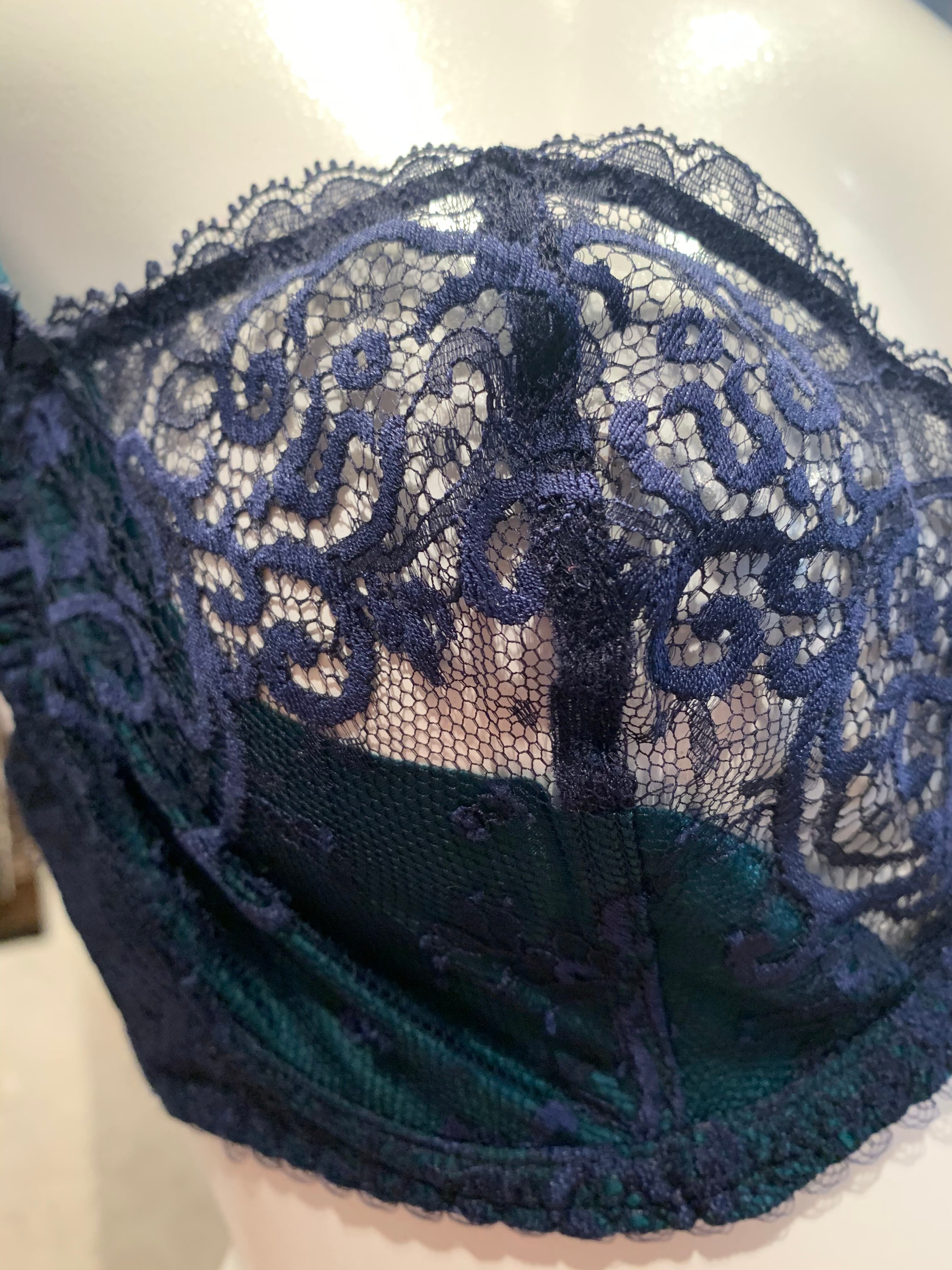 カレーリバーレースとシャイニーなサテンの極上のコンビネーションを楽しめるCourbes Divines (クルブ・ディブィン)「究極の曲線美」コレクション。今シーズン、シルキーなグリーンを効かせた大胆なミッドナイトブルーカラーが登場!気品と洗練が女性らしい曲線を、際立たせます。官能的な格子デザインとサテンリボンのアクセントを加えたクルブ・ディブィンコレクションはお洒落でアイコニックなアイテムが目白押しです。