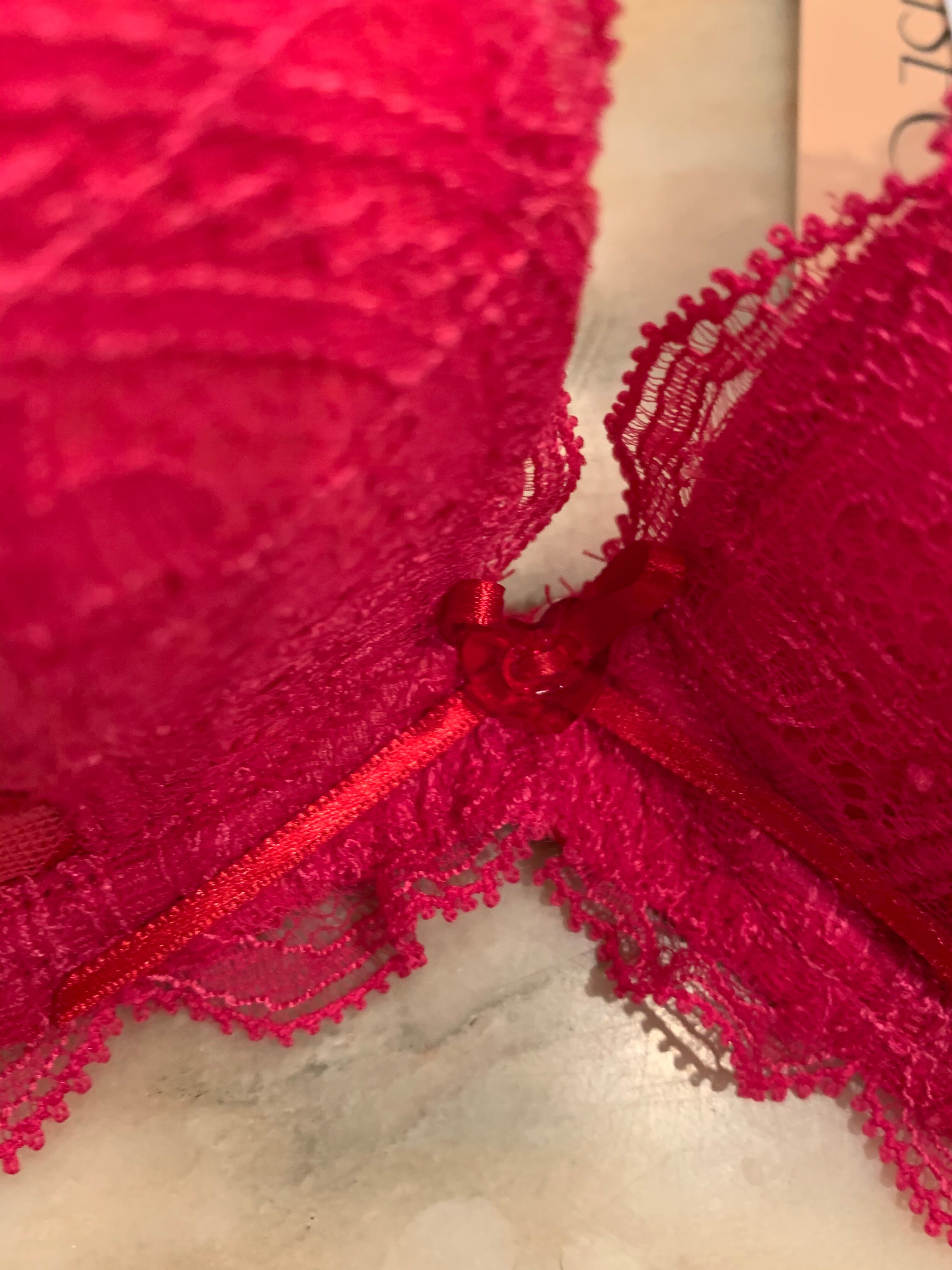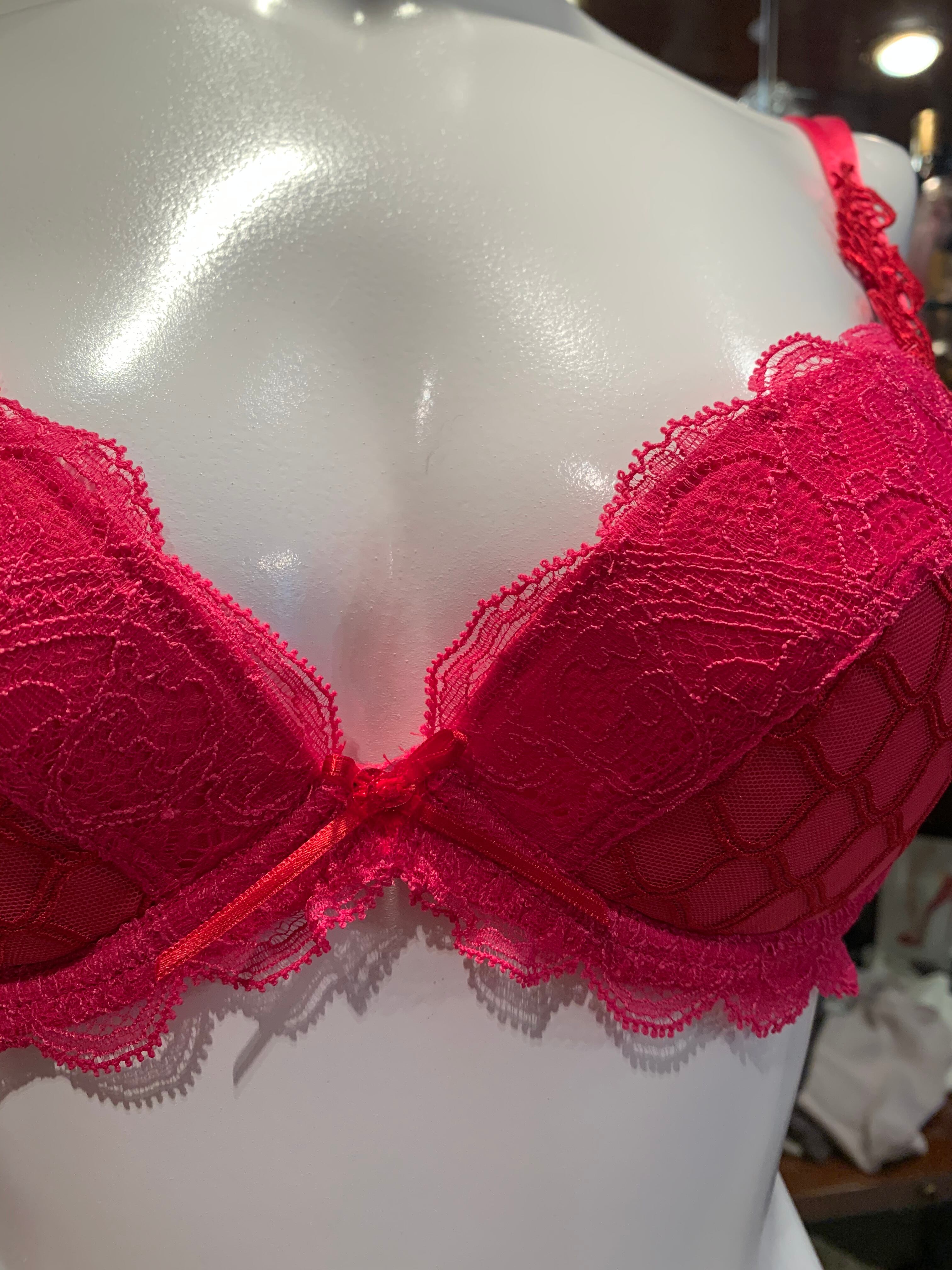 ♡ダブルパッドブラ。内ポケットのパッドは着け外し可能です。カップに刺繍されたレッドのチェーン模様が華やかに飾られています。サテンのスパゲティ紐もデコレーションされ、ひときわゴージャスです。