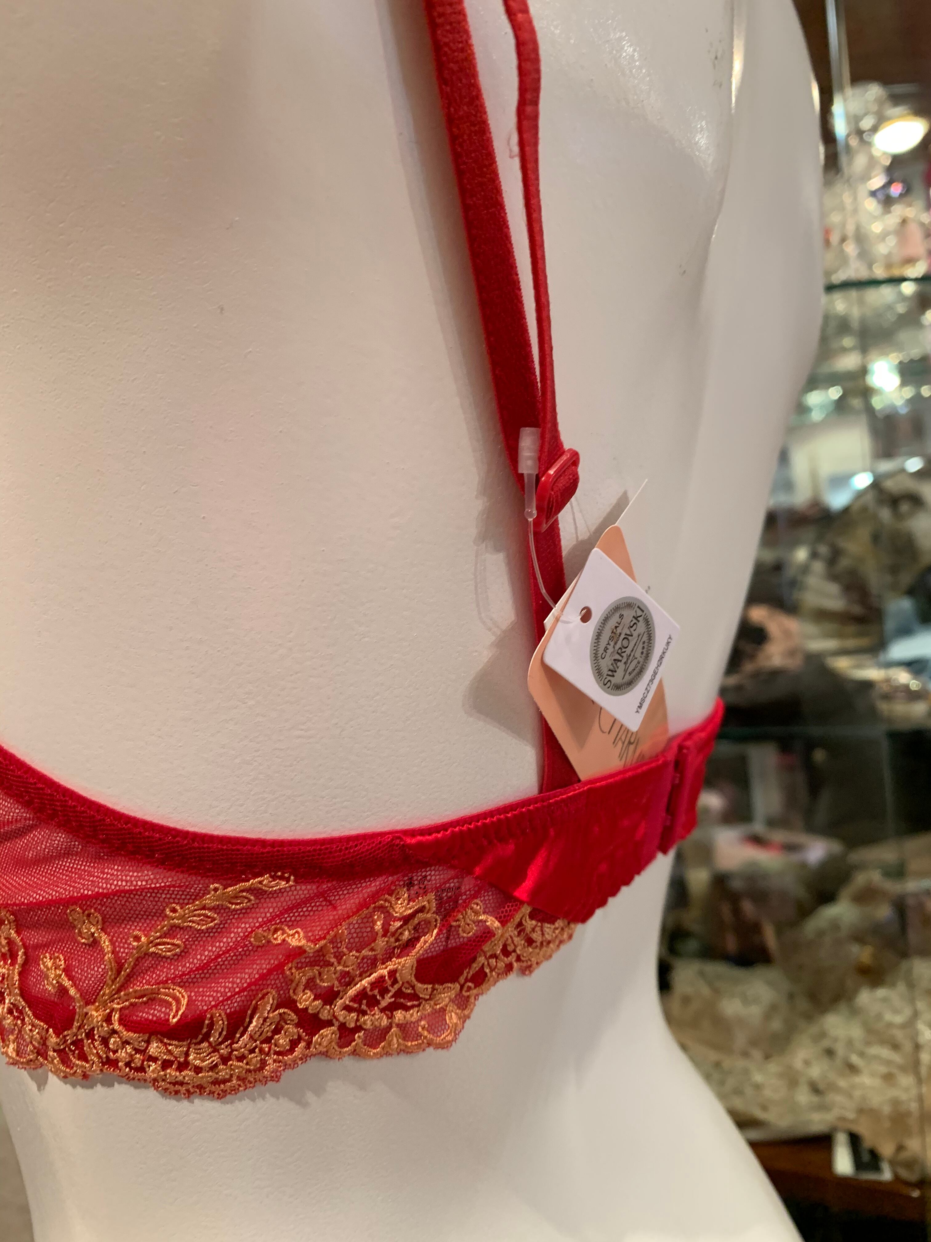♡ワイヤー入りのモールドカップブラ。厚底プッシュアップタイプ。ふっくら丸みを帯びたシルエットを作ります。シルクサテン地の美しい艶にモチーフのレース。中央には眩しいばかりのスワロフスキーのチャームが飾られています。
