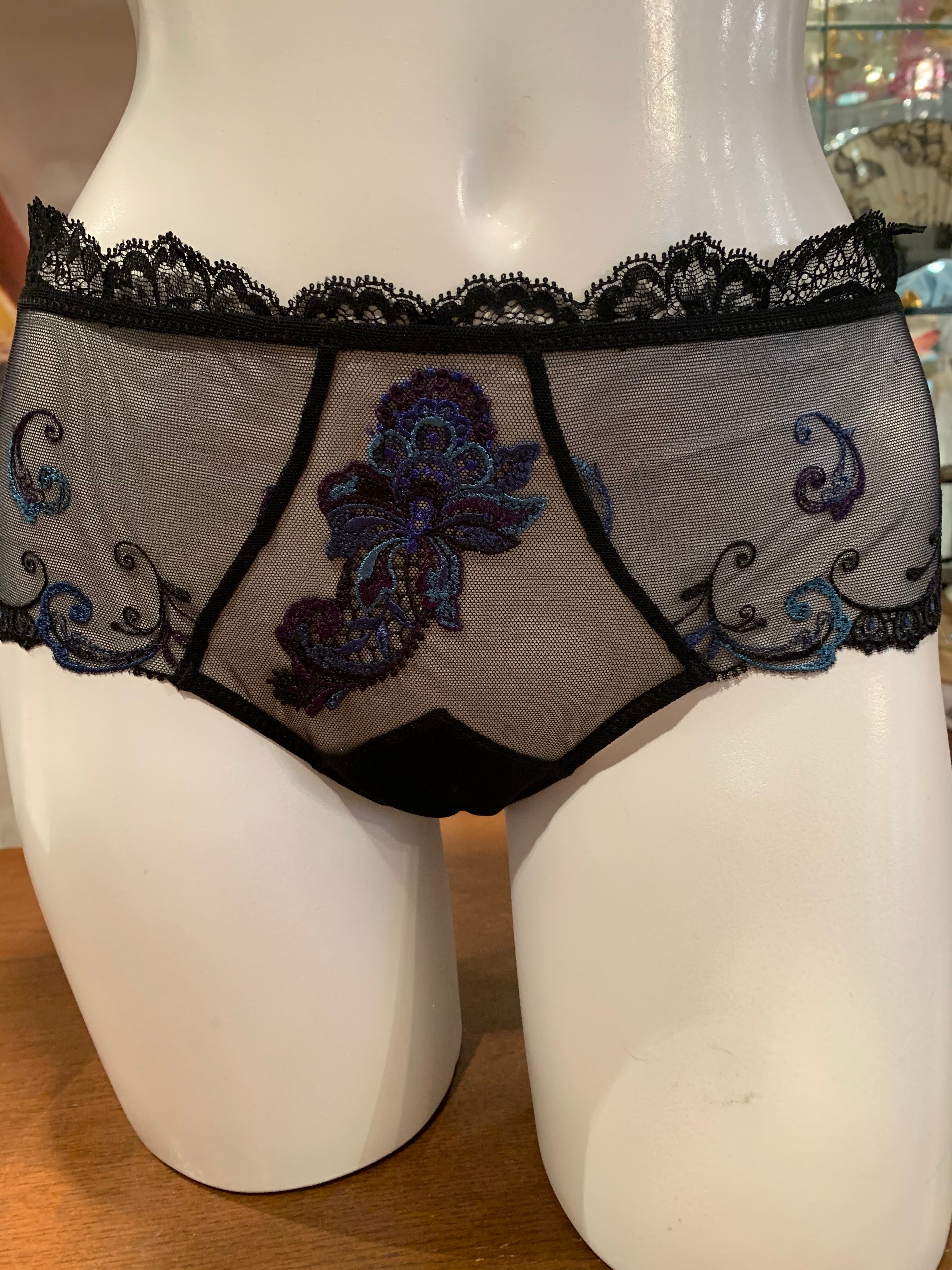 ♡セクシーなヒップハンガー。ブルーグラデーションのレースモチーフが、透け感たっぷりのチュール地の上でシャープでリュクスな輝きを放ちます。