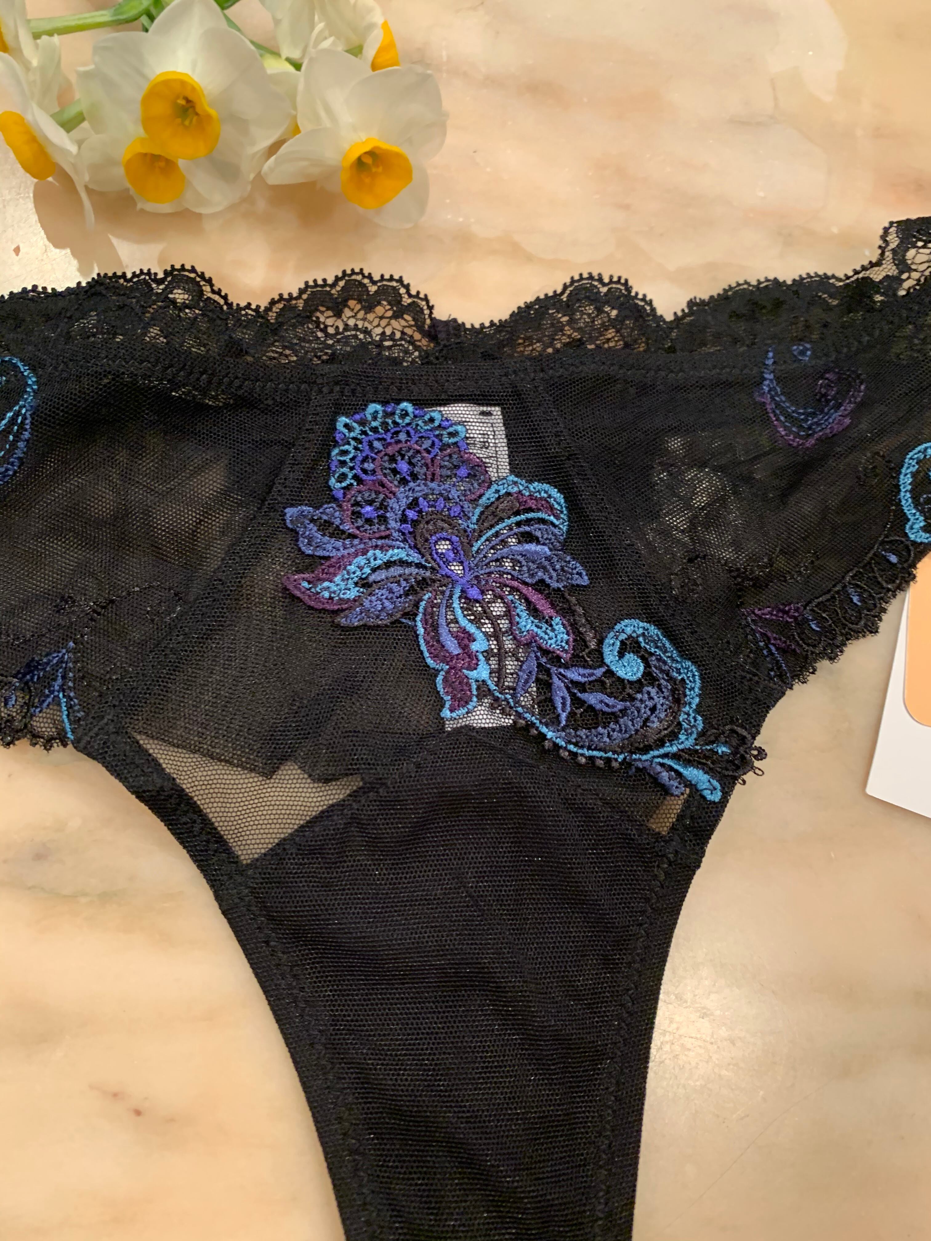 サファイアをイメージしたブルーのカラートーンのレースには、輝きのある糸も使われていて、ブラック地の上でモチーフを強調しています。インポートならではの高級感があふれています。