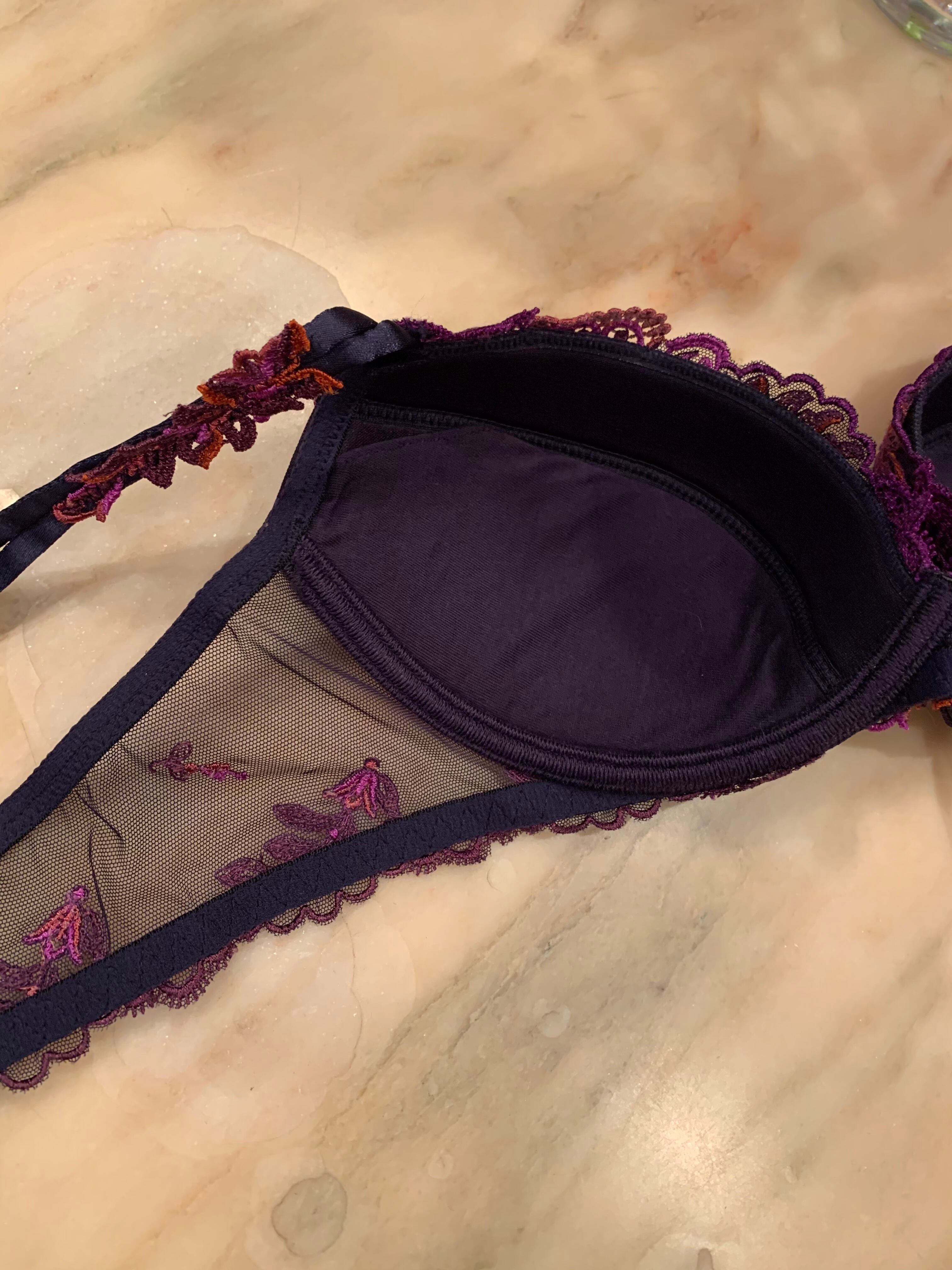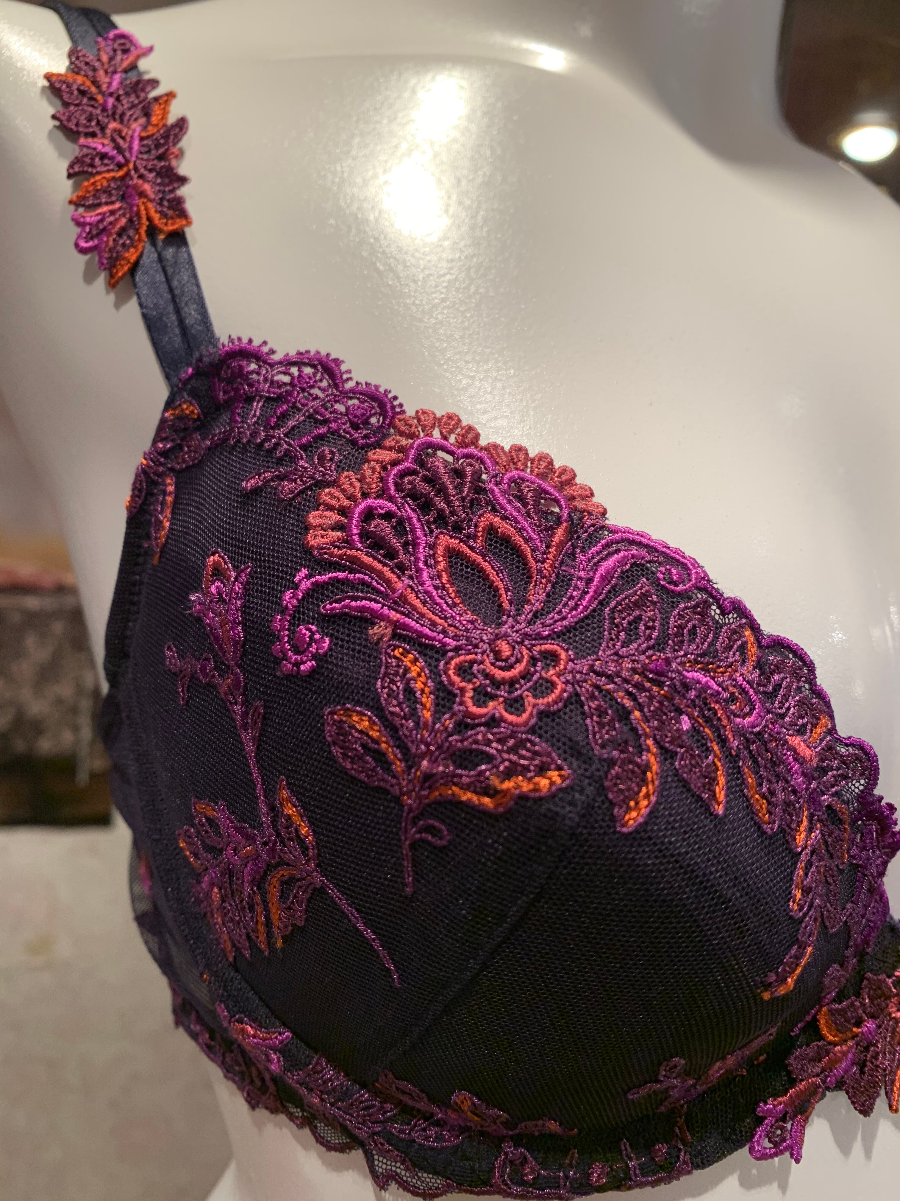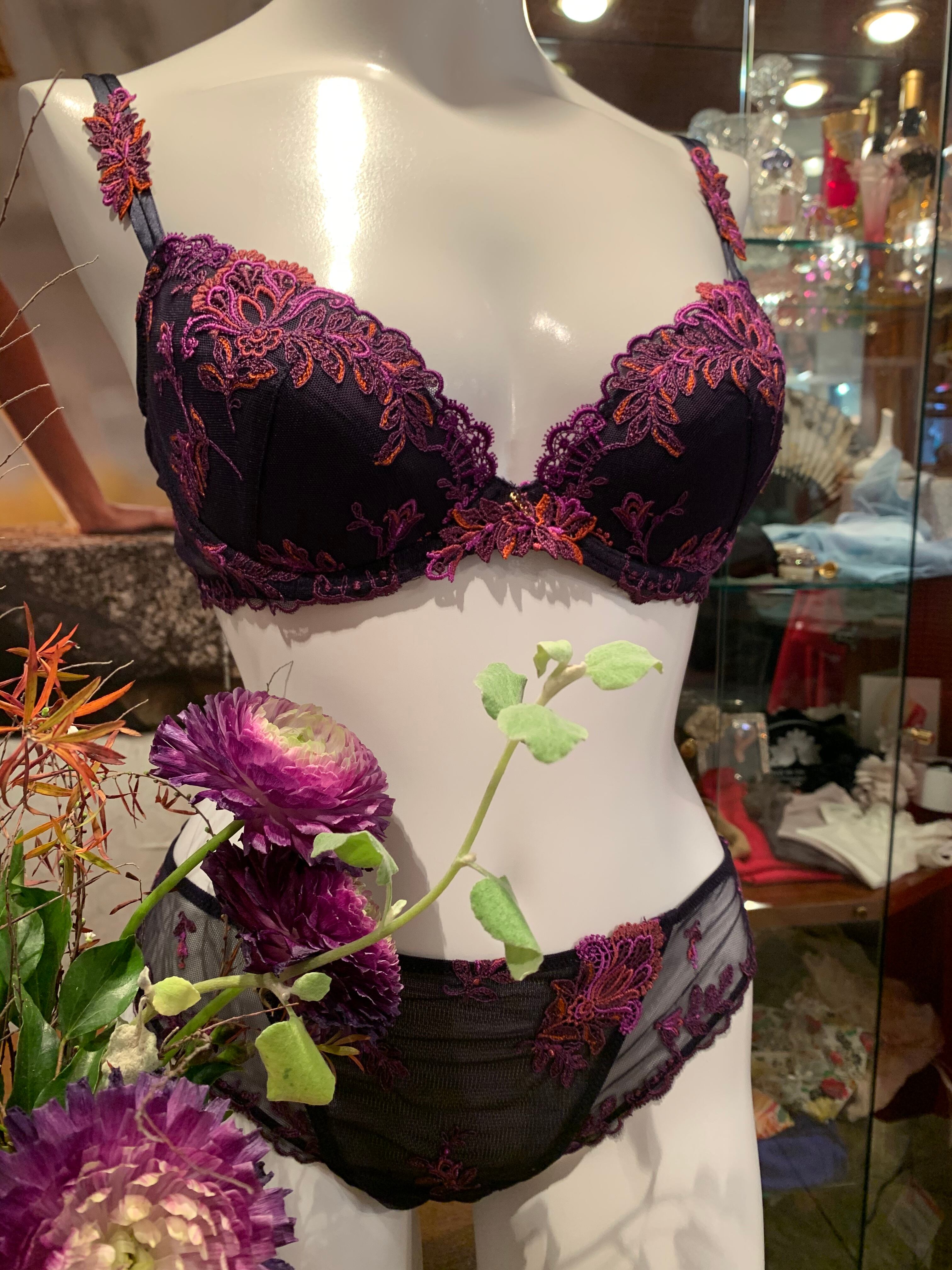 ワイヤー入りのダブルパッドブラ。深いデコルテがセクシー。ギュピールレースのモチーフが肩紐やカップ上部と中央に贅沢に付いています。中央にはスワロフスキー。