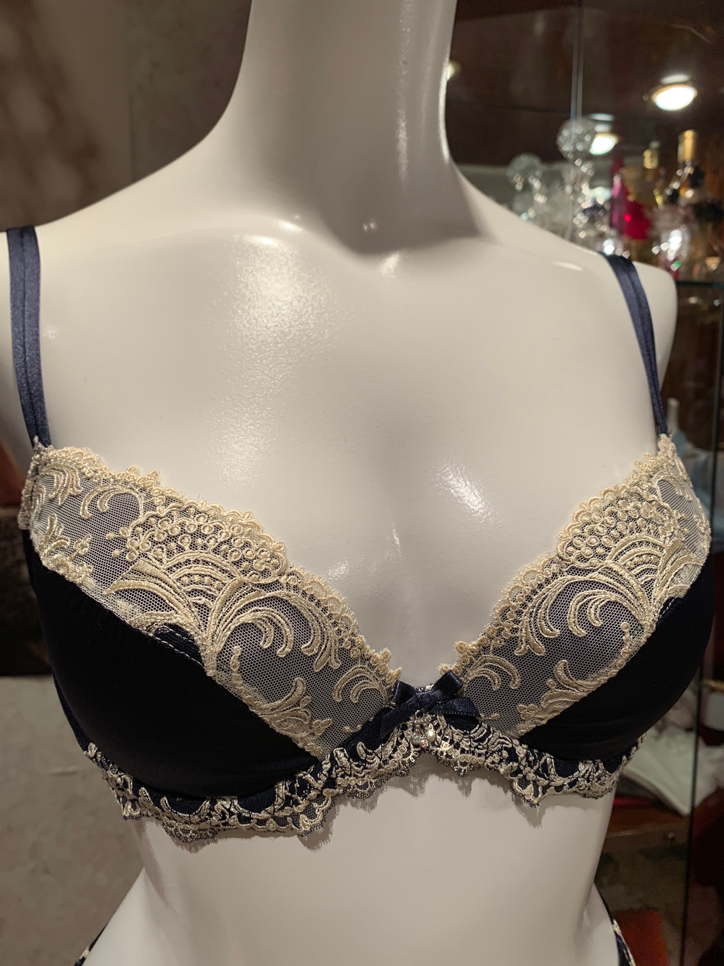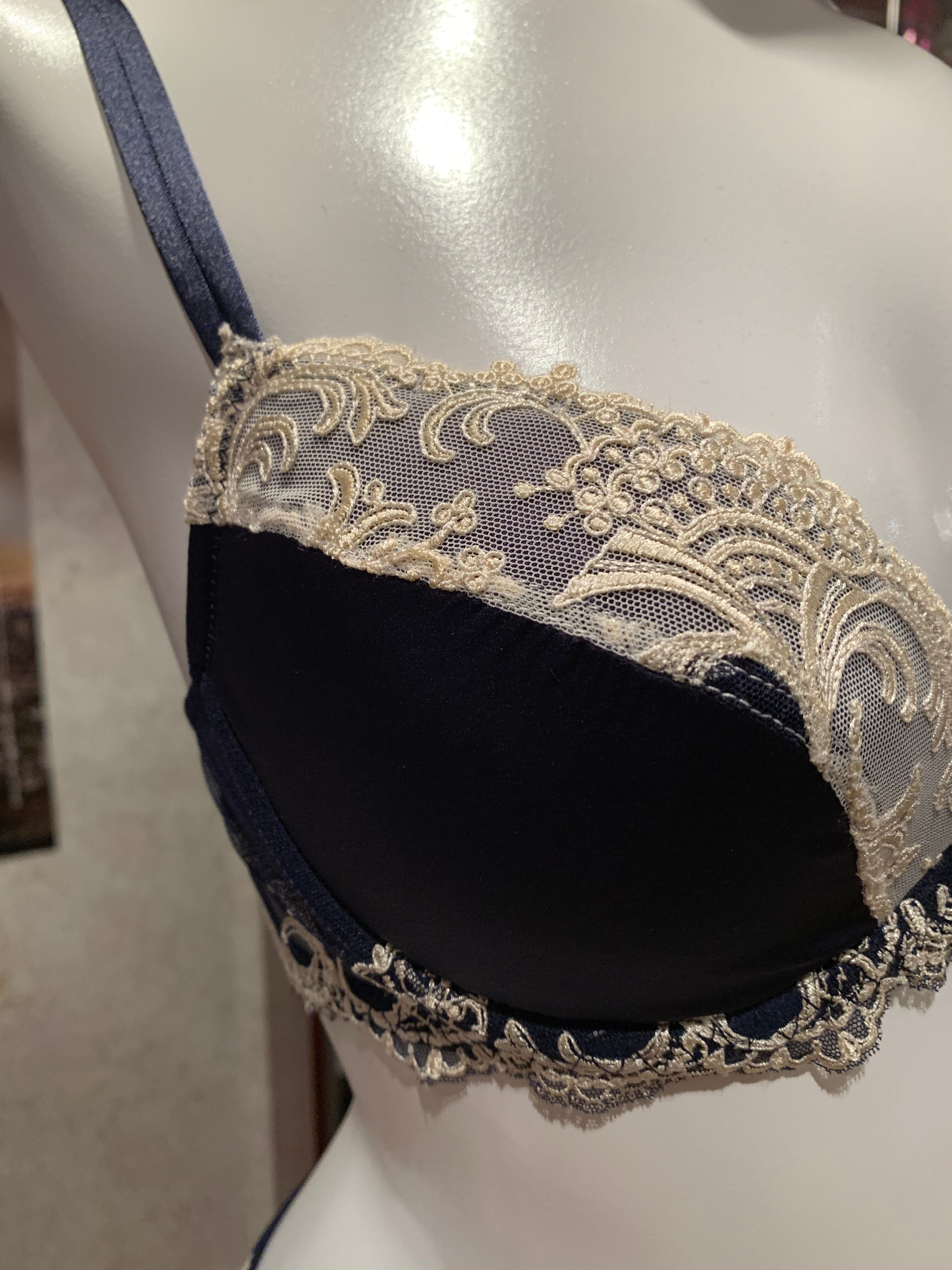 ネイビーベースに、フェミニンなやわらかさのあるシャンパンカラーのレース。