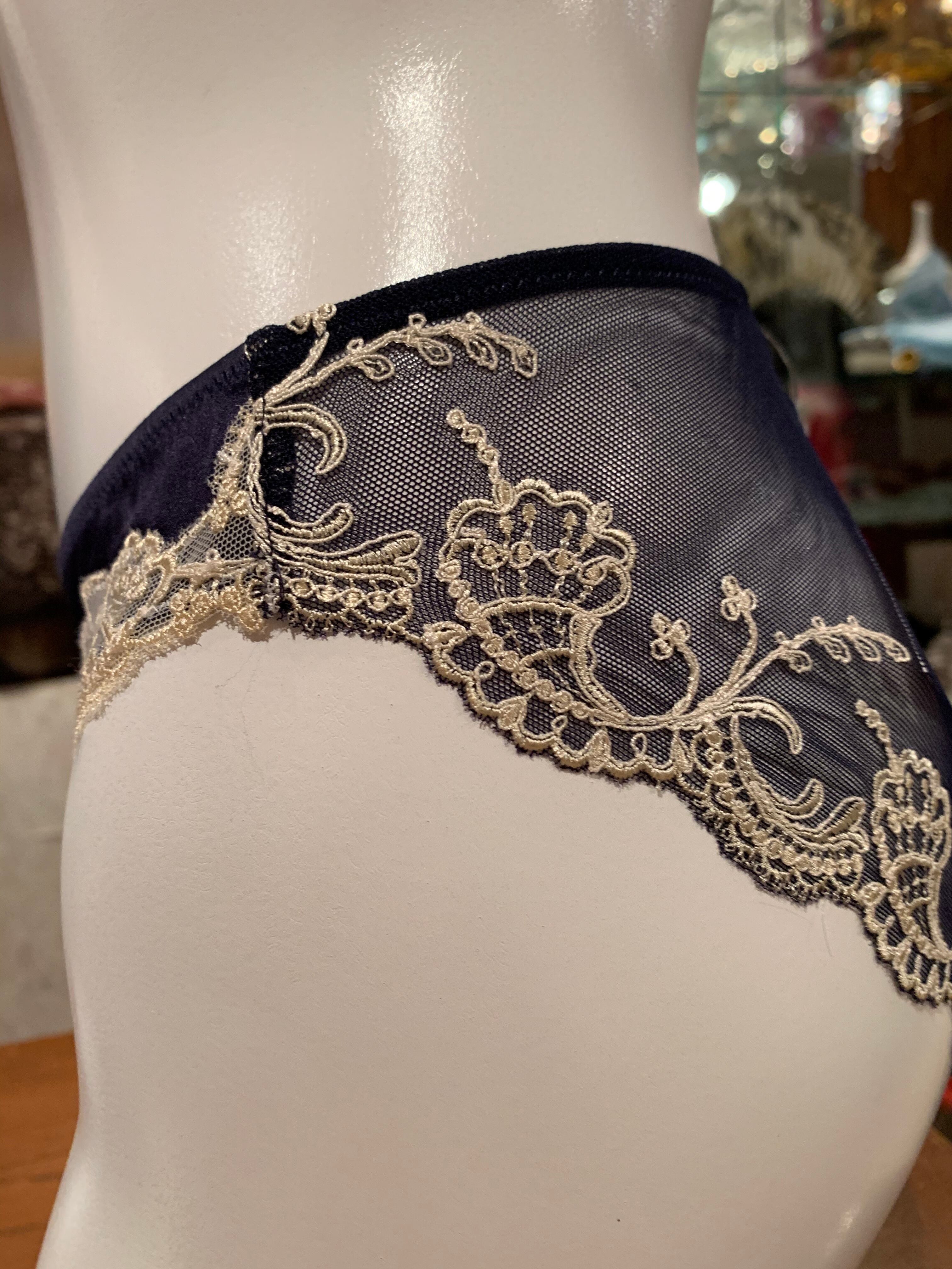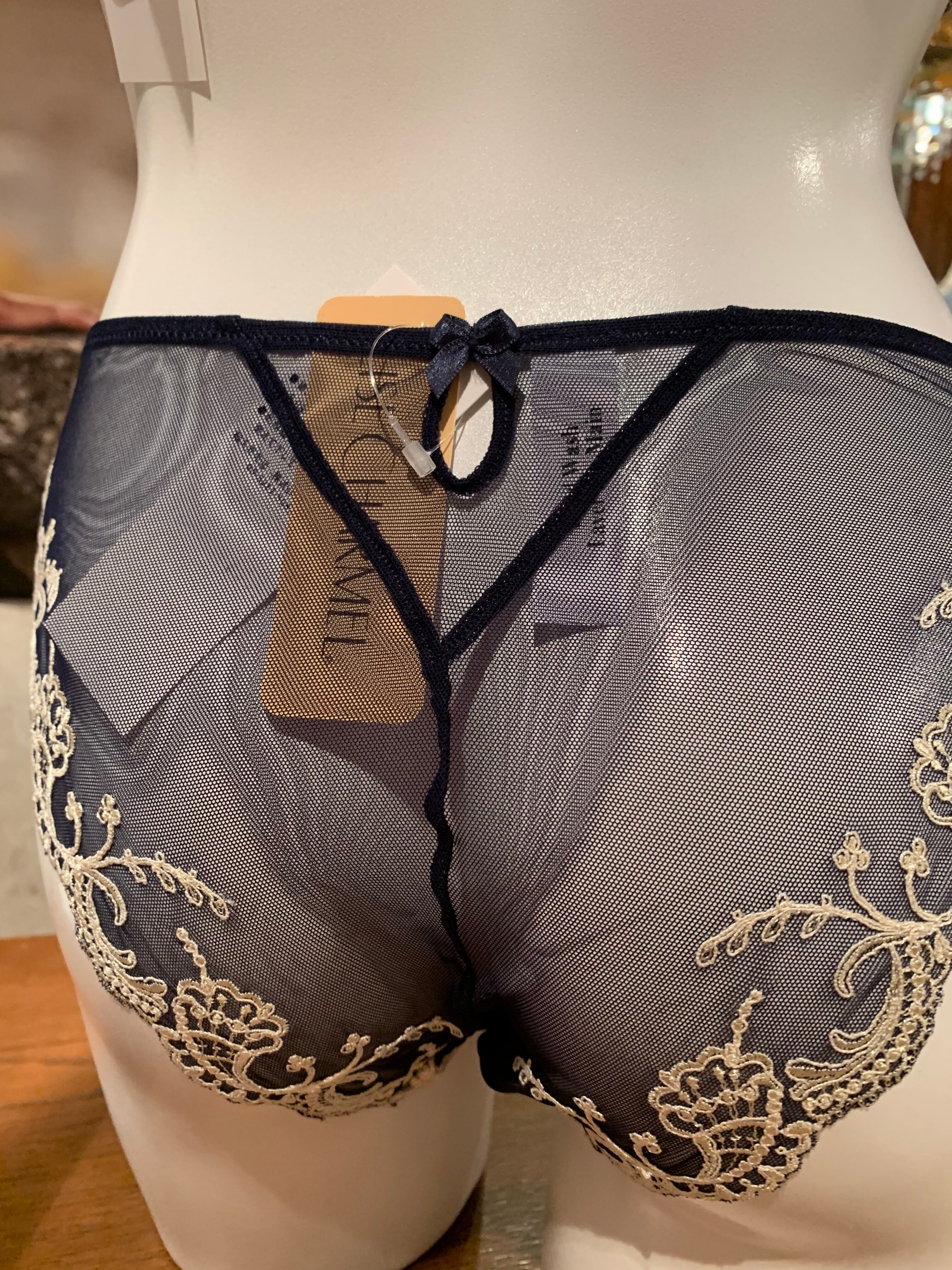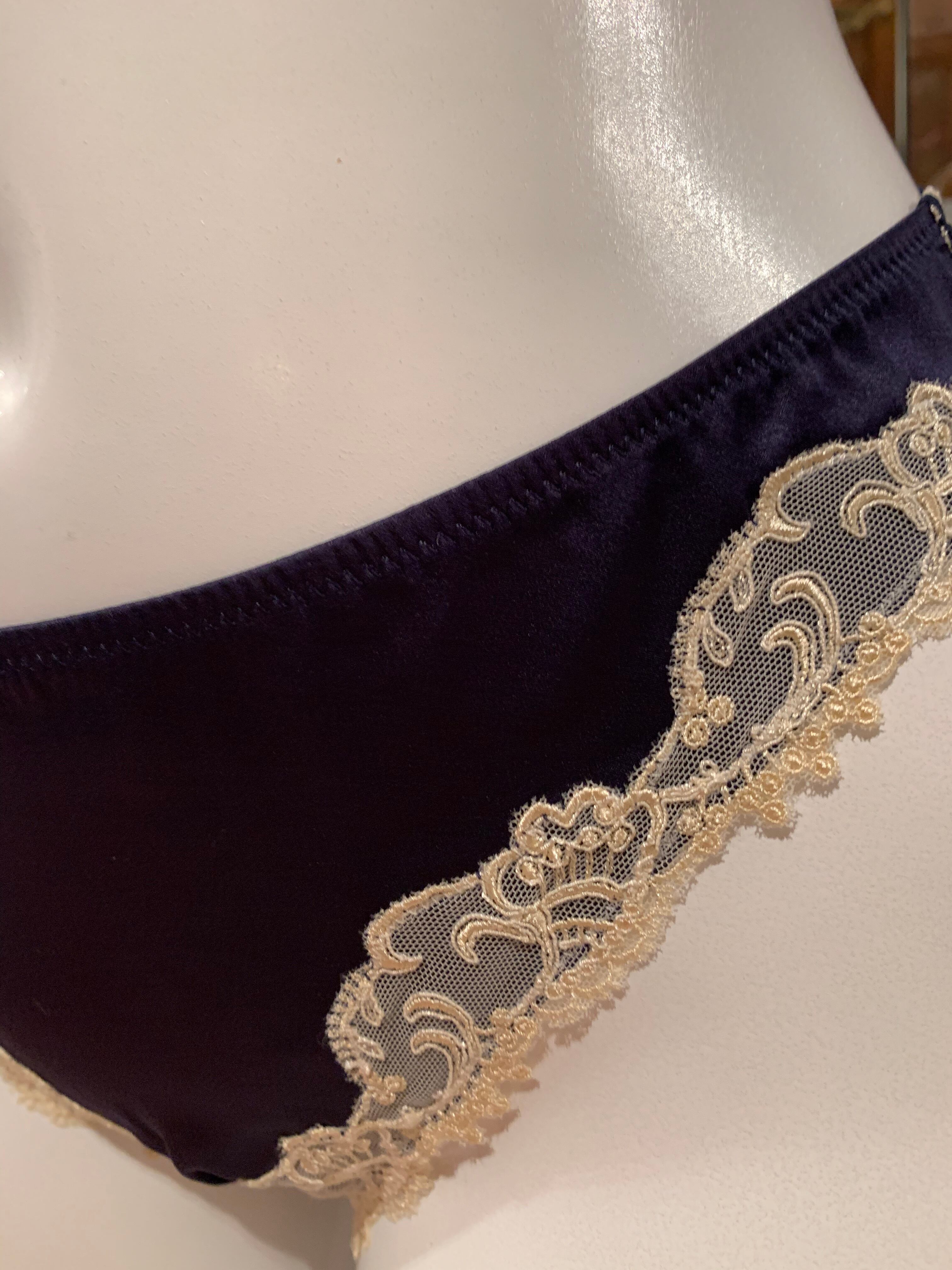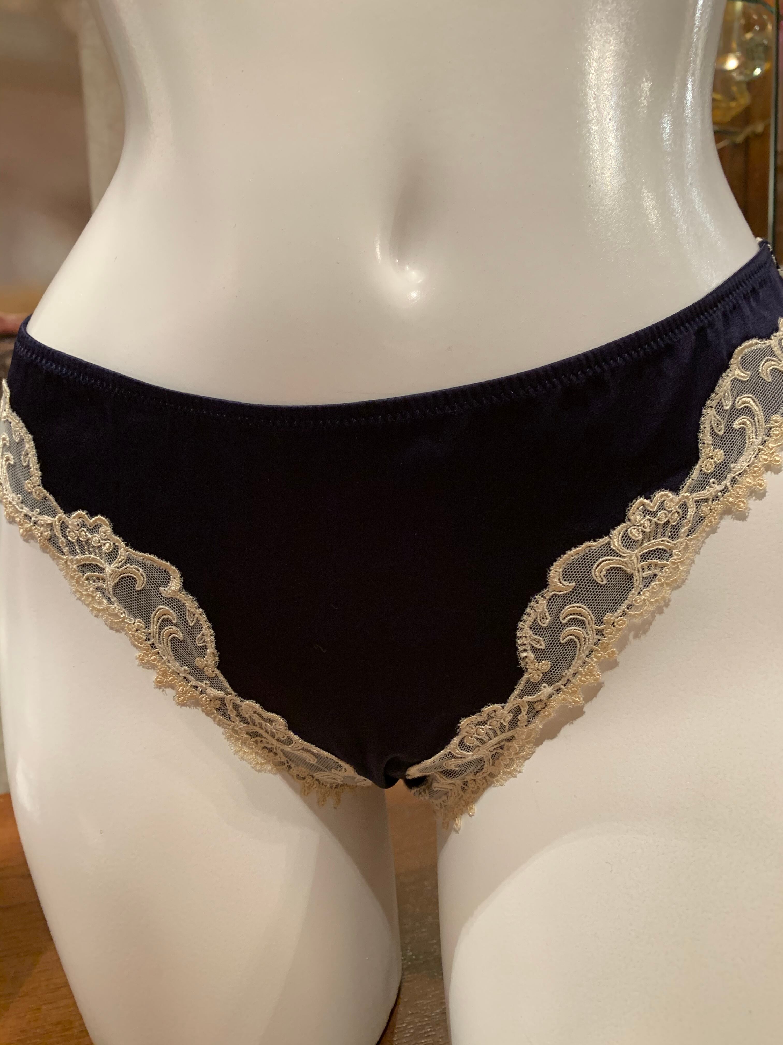 上品なイタリアンショーツ。フロントはシンプルにシルクサテン地でクールに、バックは美しい透け感とレースを堪能。