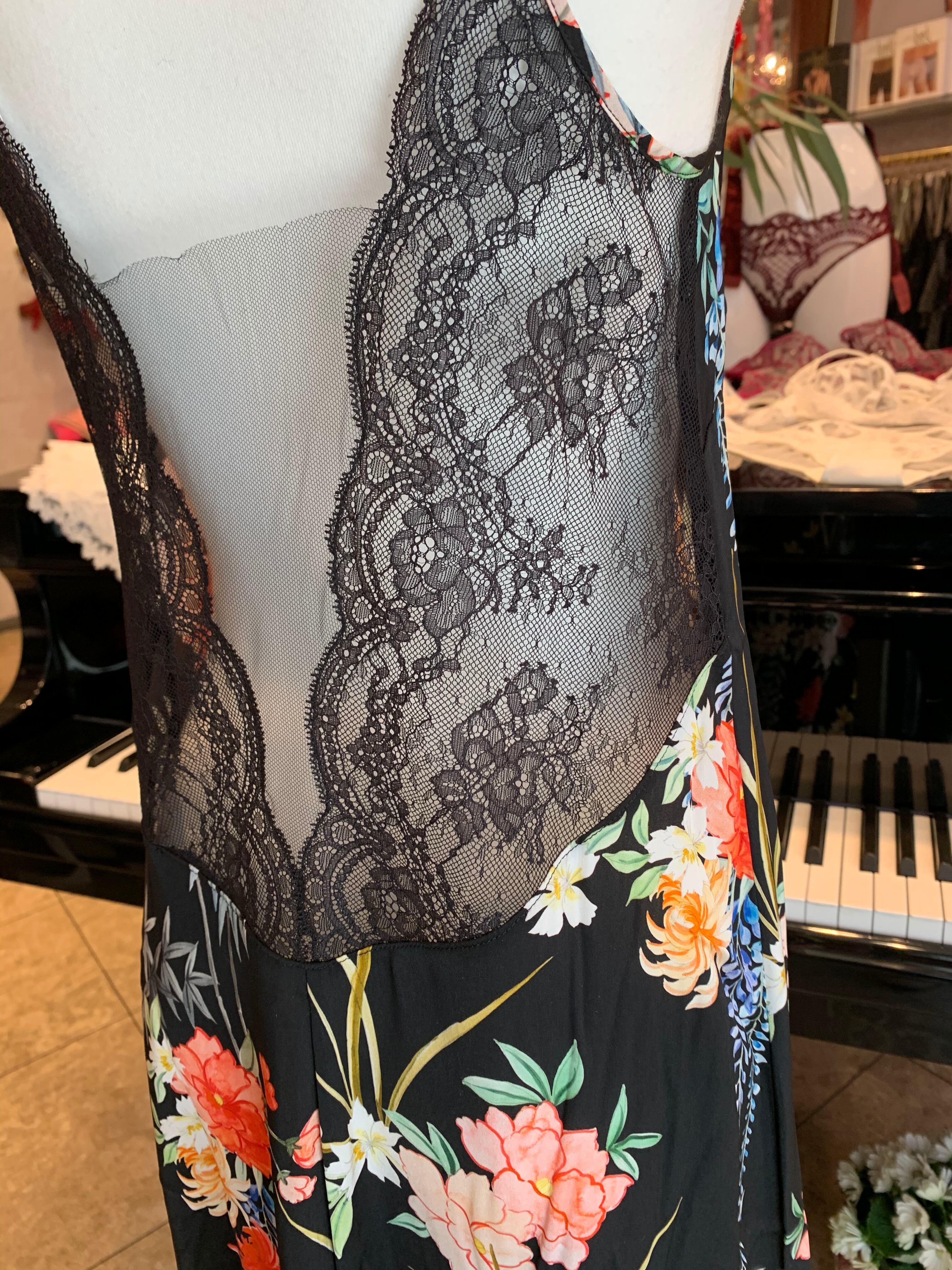 幸せオーラを放つカラフルなプリント柄です。ブラックの背景が、花の繊細な色合いとやわらかいニュアンスを引き立てています。