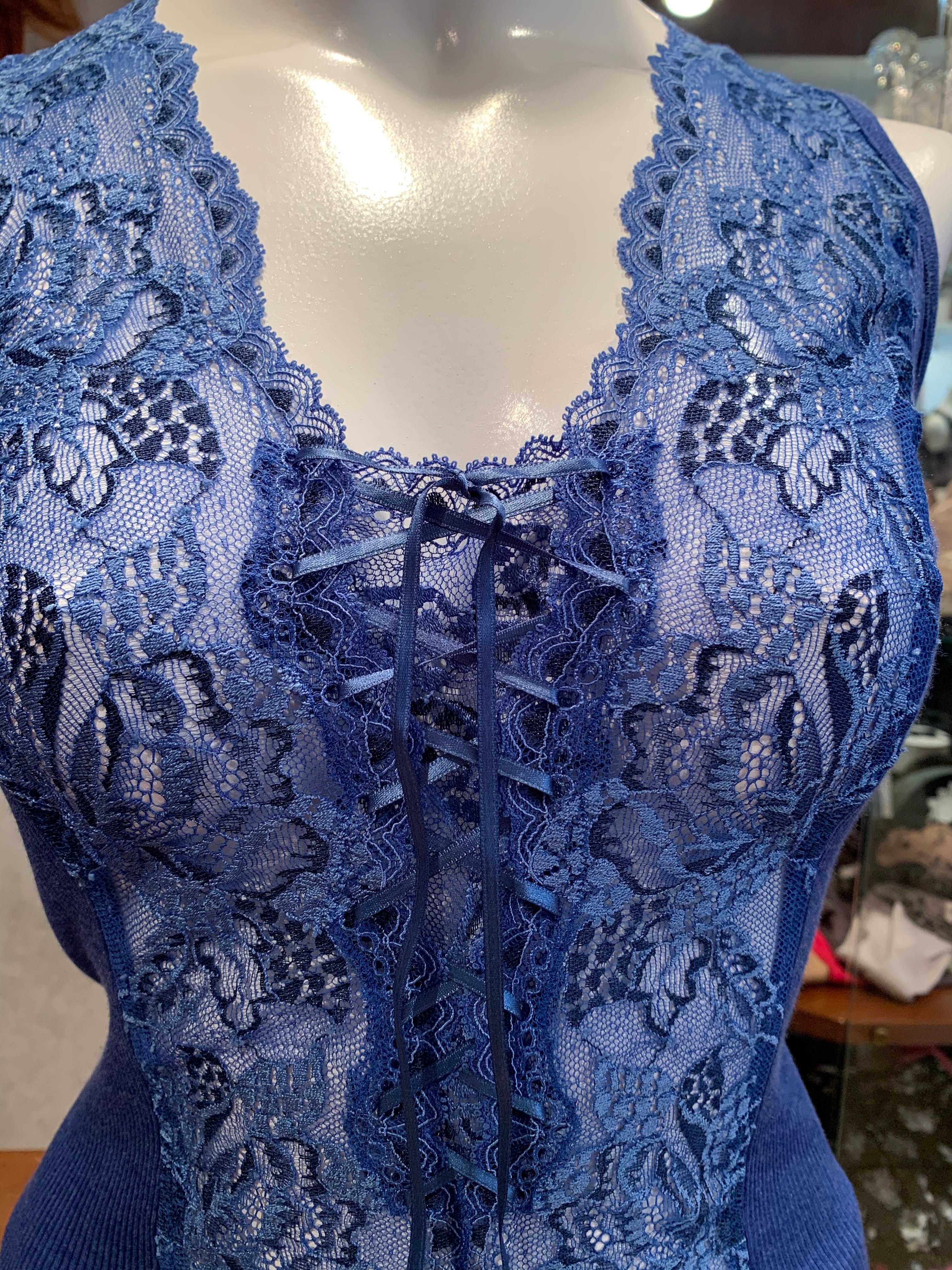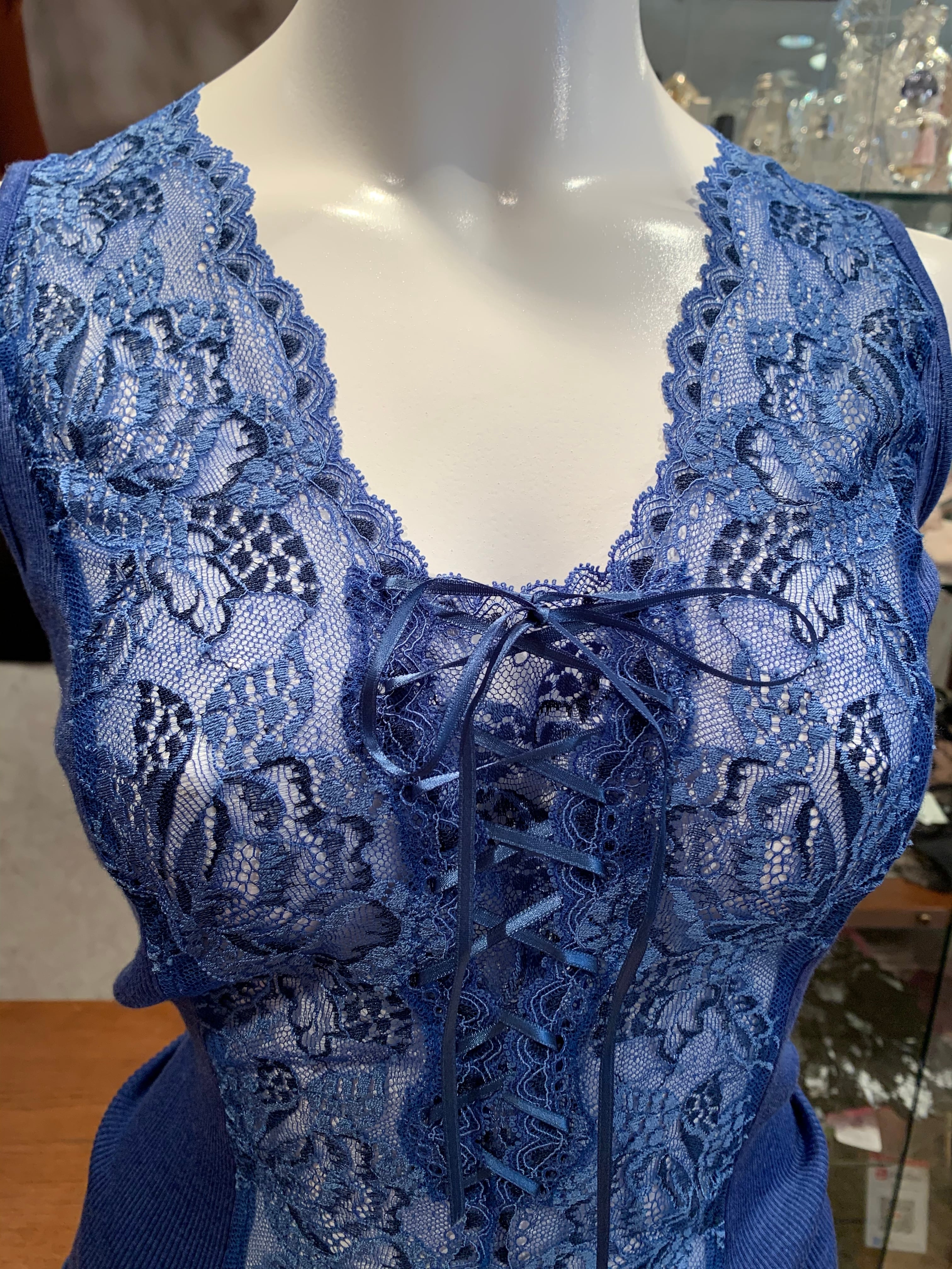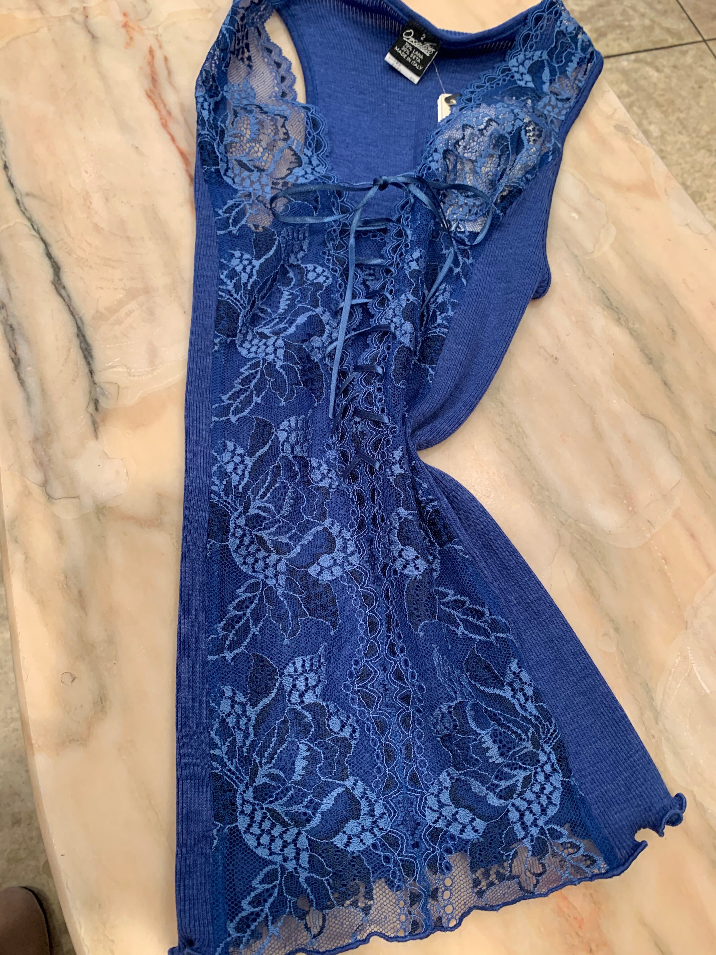 ♡珍しいデニムカラー。ジャケットインなど色々な楽しみ方があります。前面は美しいリバーレースを使いとても華やかな仕上がりになっています。
