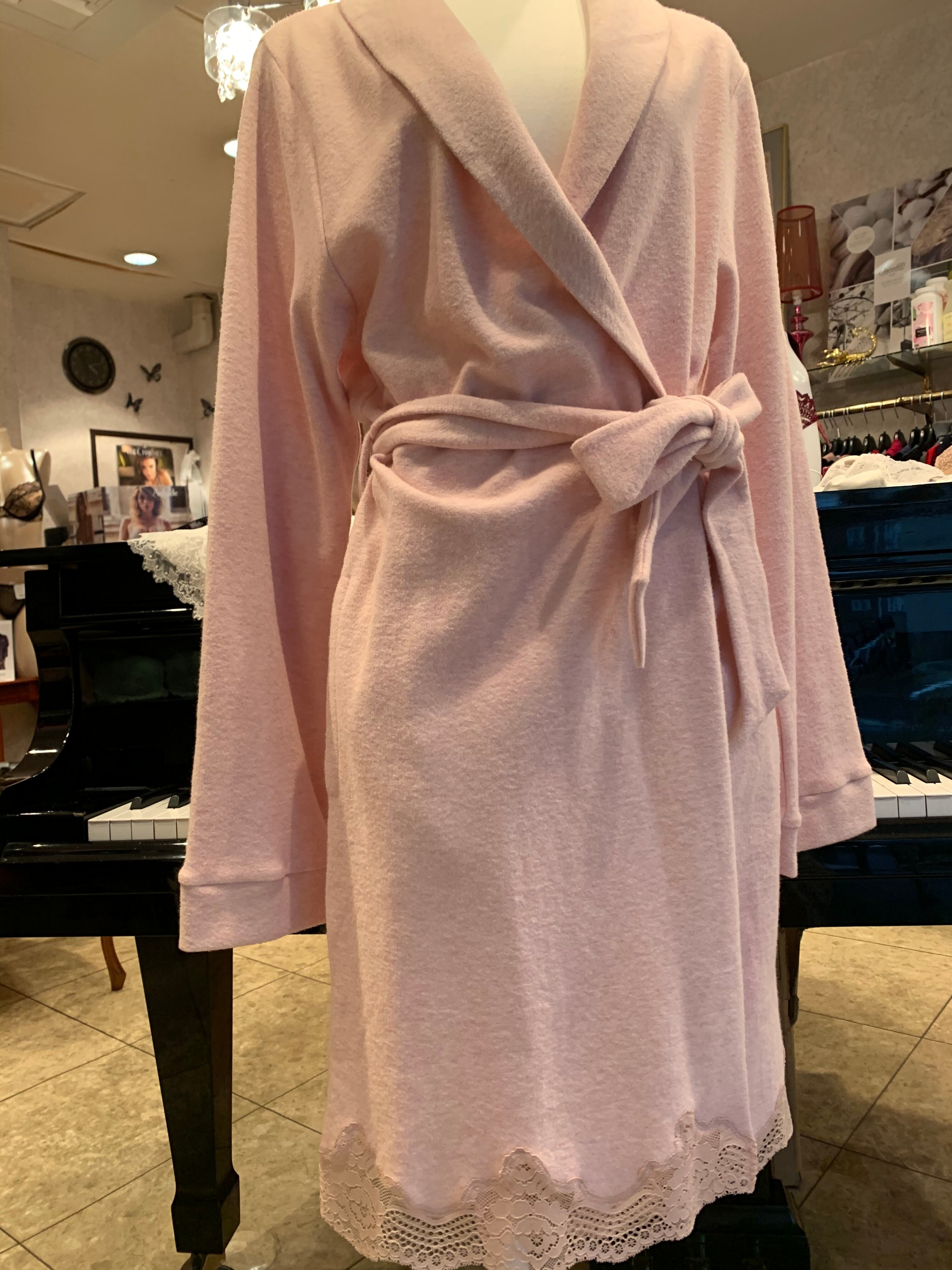 着丈も長すぎず、デイリーにピッタリ。両サイドにインポケットがあり便利です。裾のレースがガウンにしてはロマンティックなお仕上げになっています。