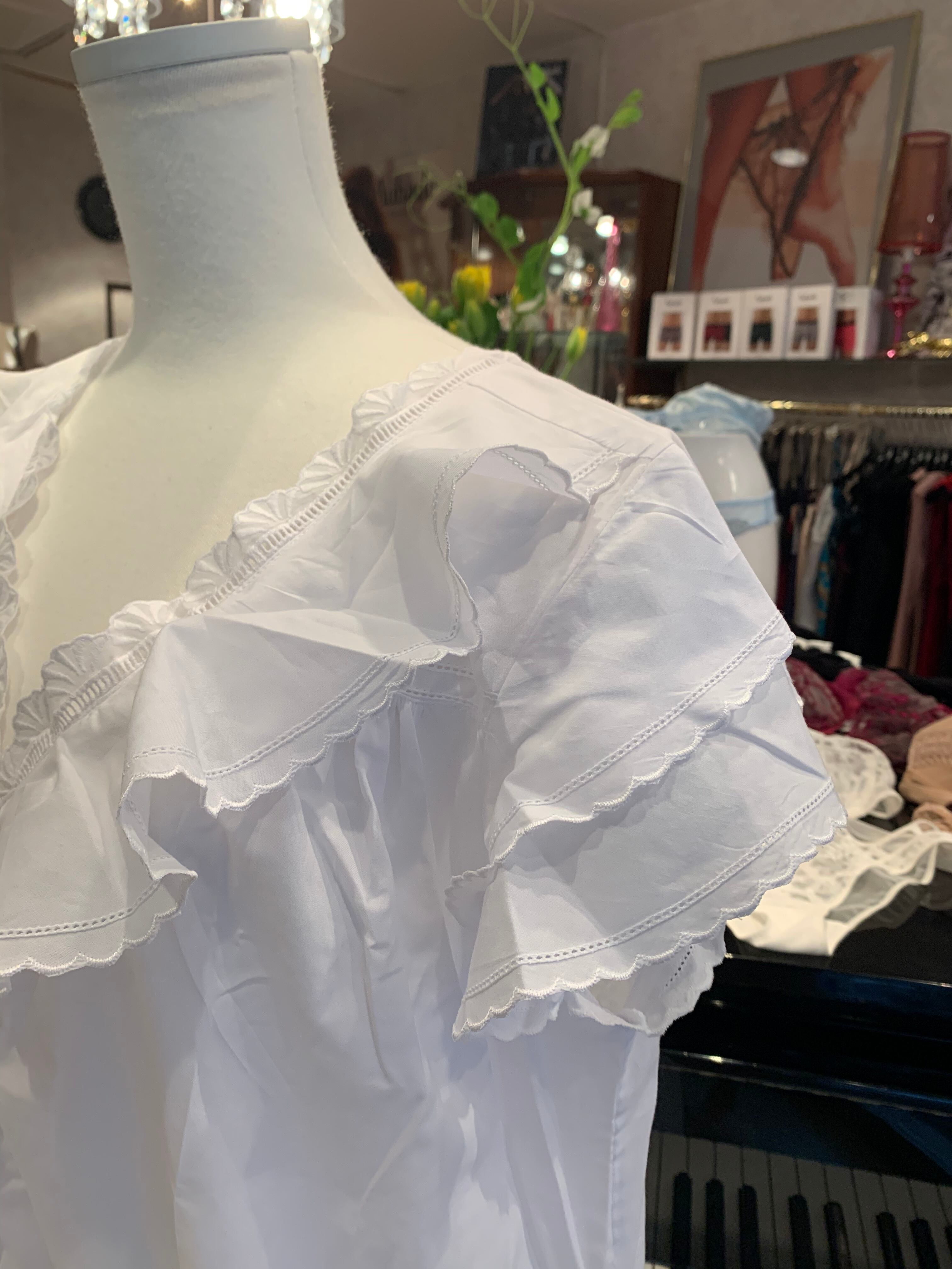 胸元とお袖にかけてのダブルフレアがとてもロマンティックなナイティです。