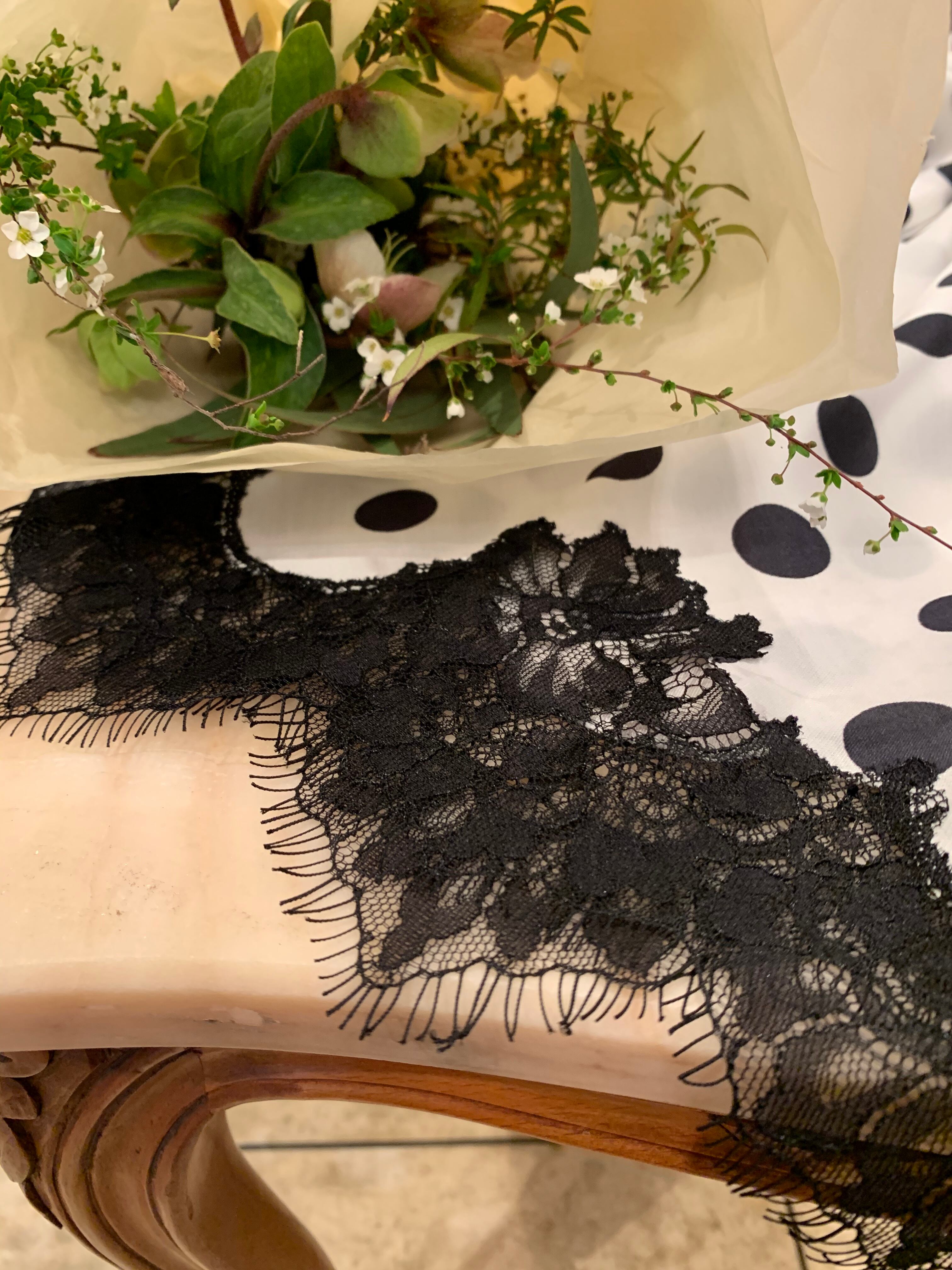 ドットの程よい大きさと黒のストラップ、黒の美しいリバーレースが女性らしさとゴージャスさを醸し出しています。少し身体に沿うようにシェイプされたラインが美しいシルエットを出してくれます。