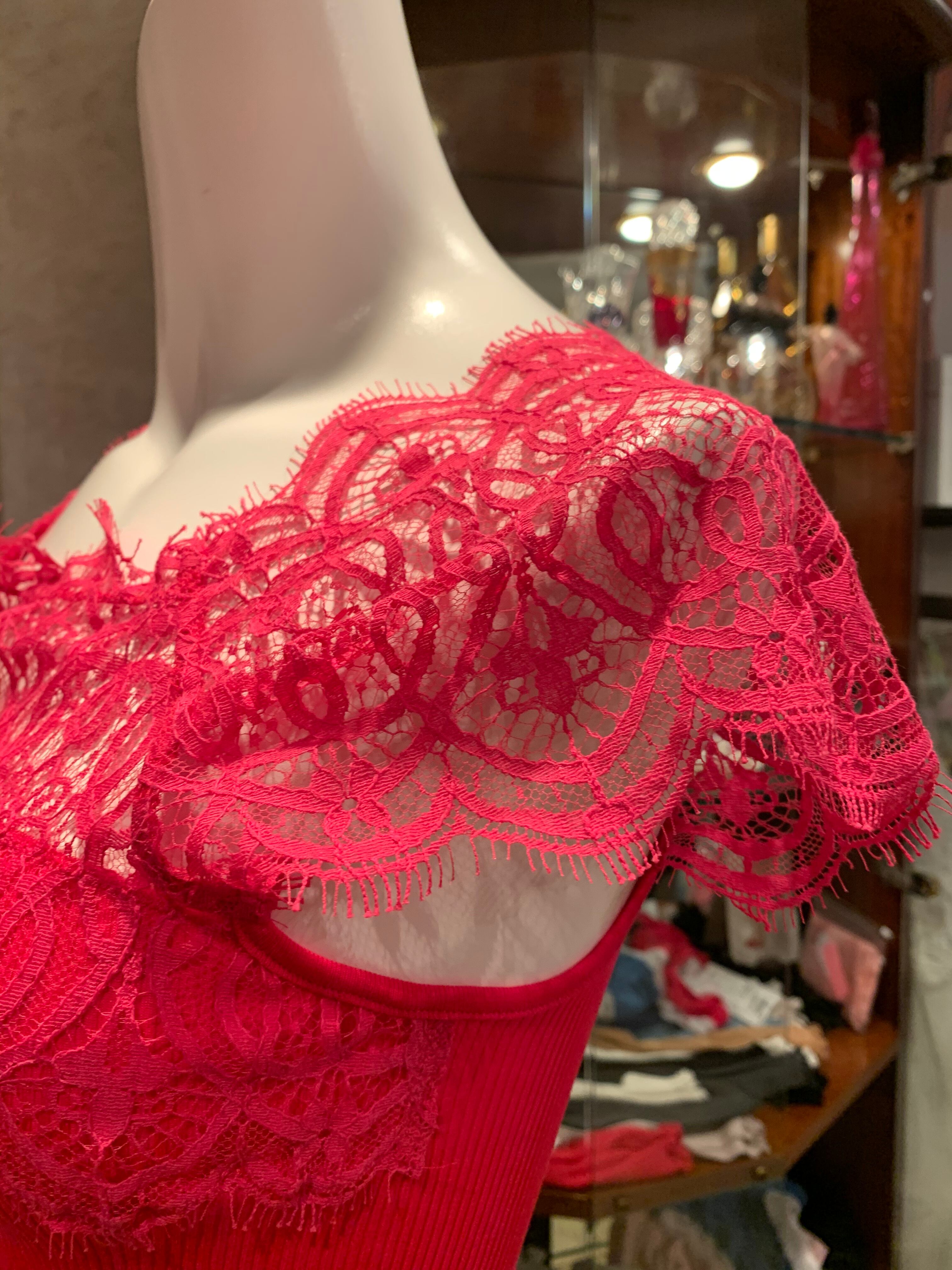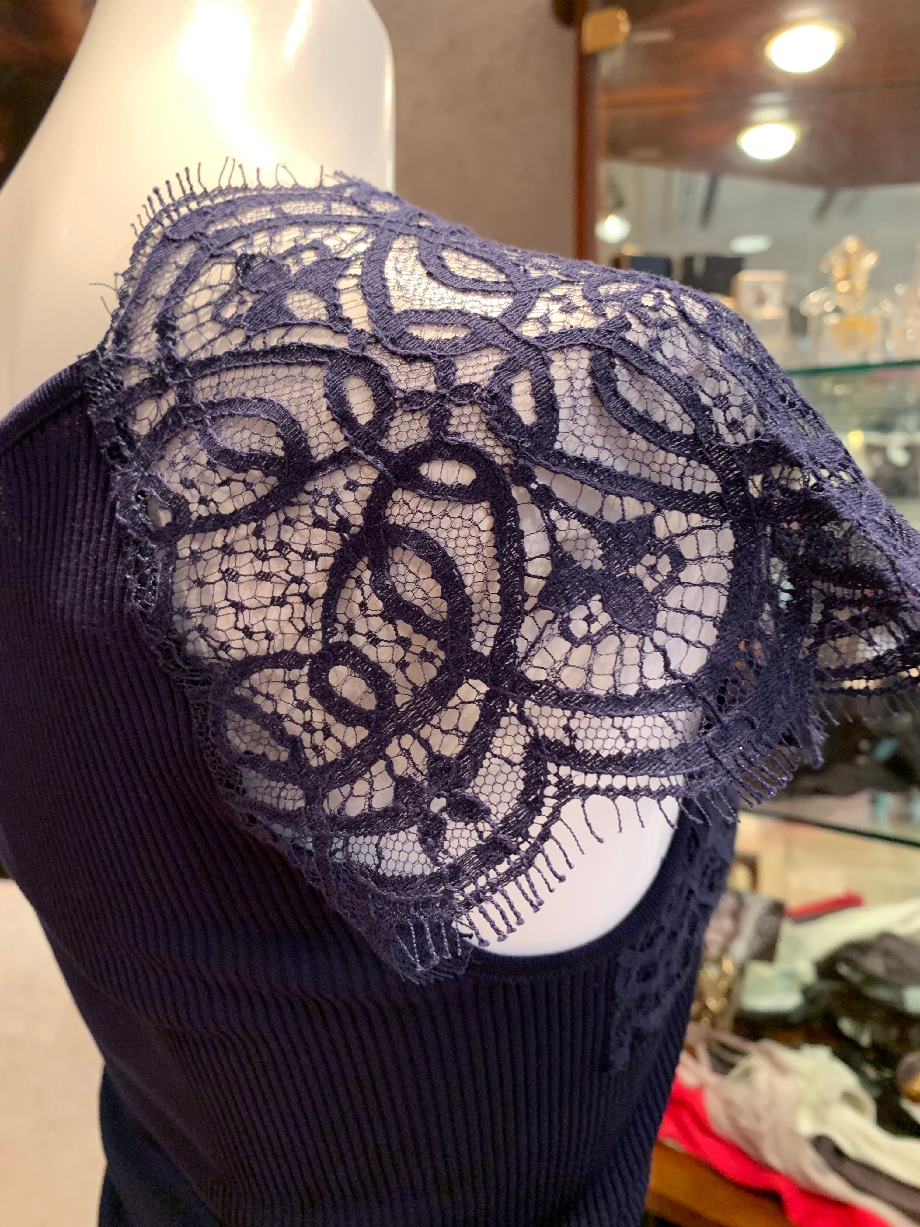 デコルテラインからフレンチスリーブにかけてのゴージャスなレースに胸がときめきます。ジャケットインに、又これ一枚でも絵になります。