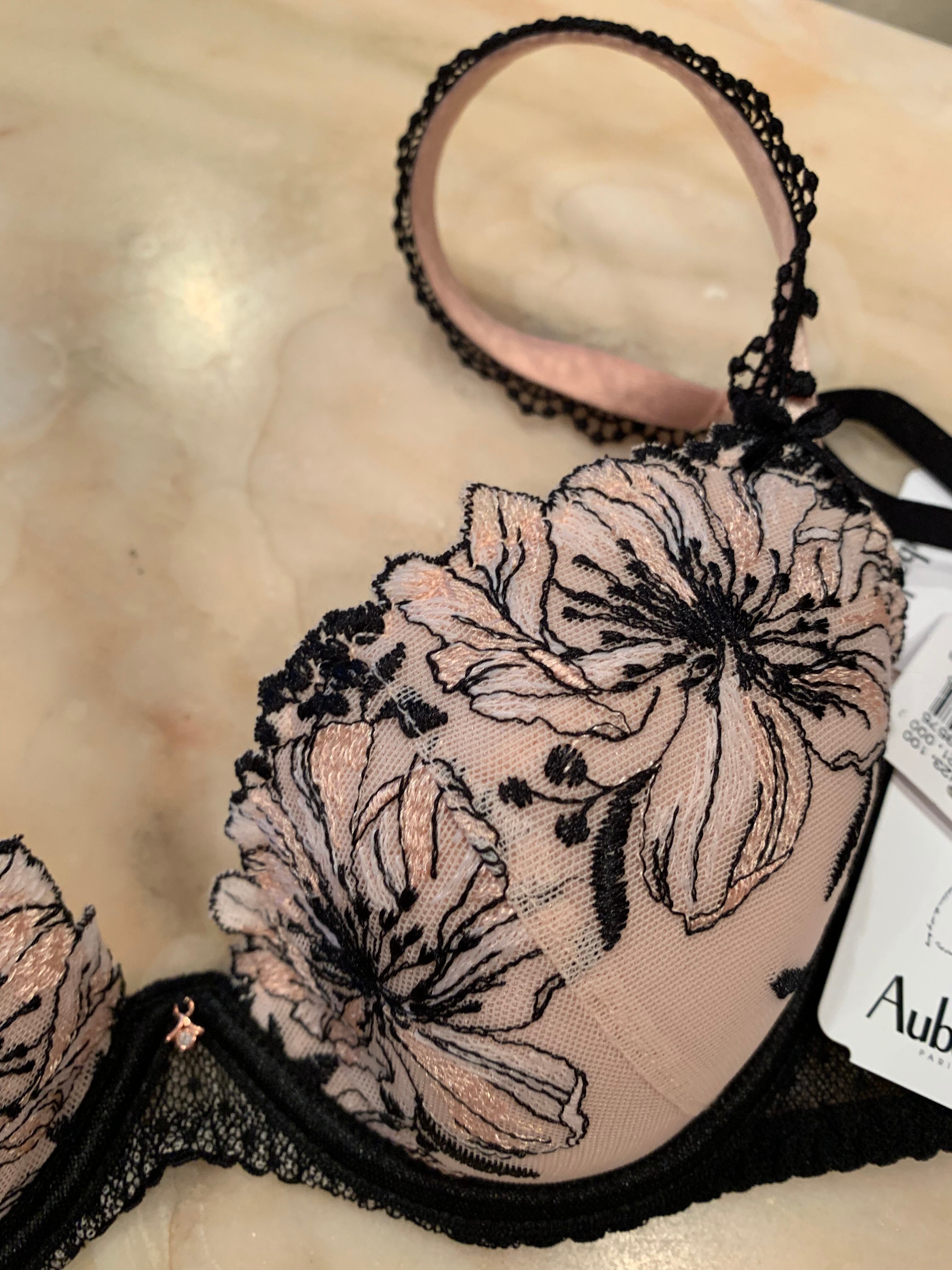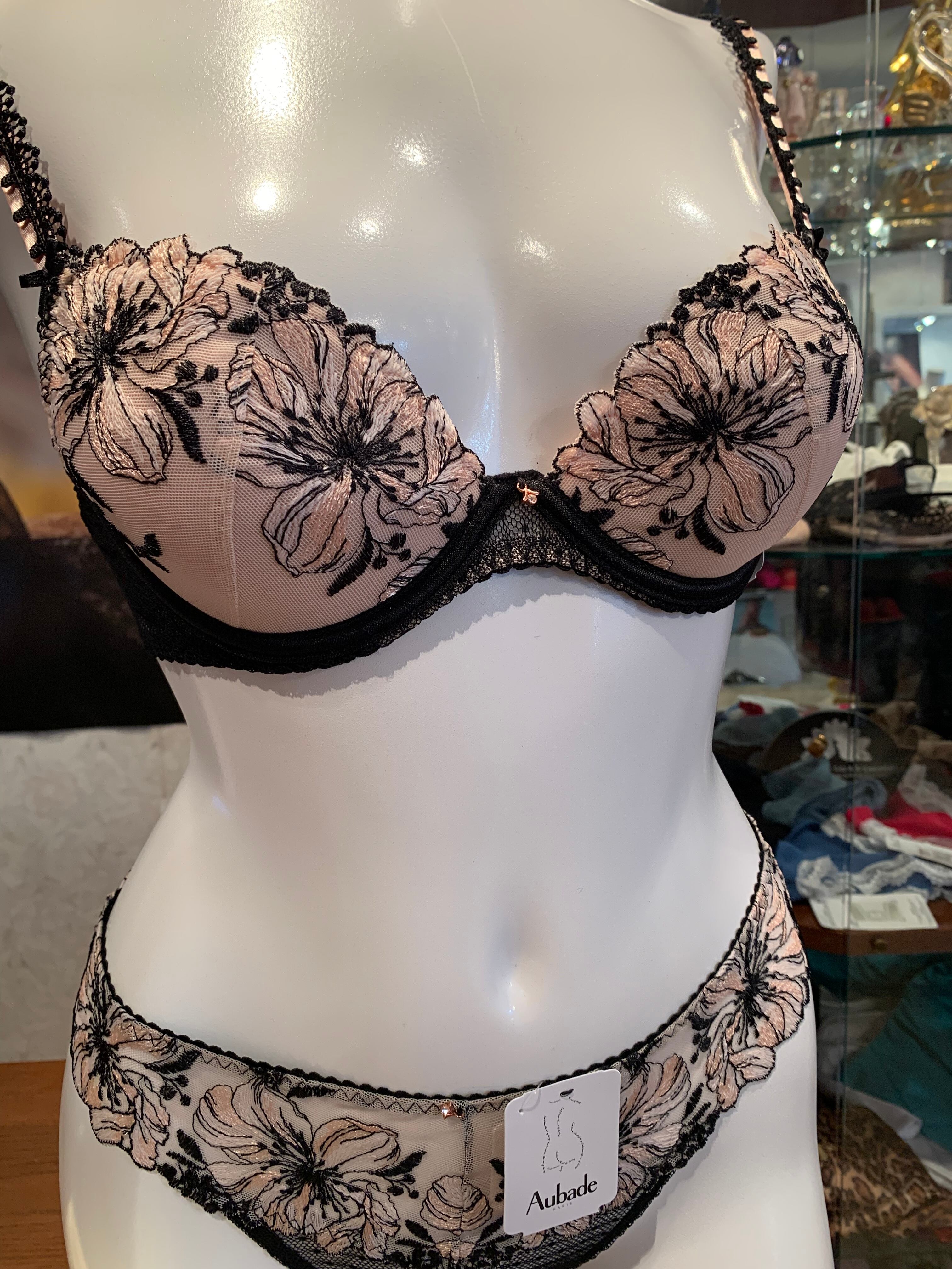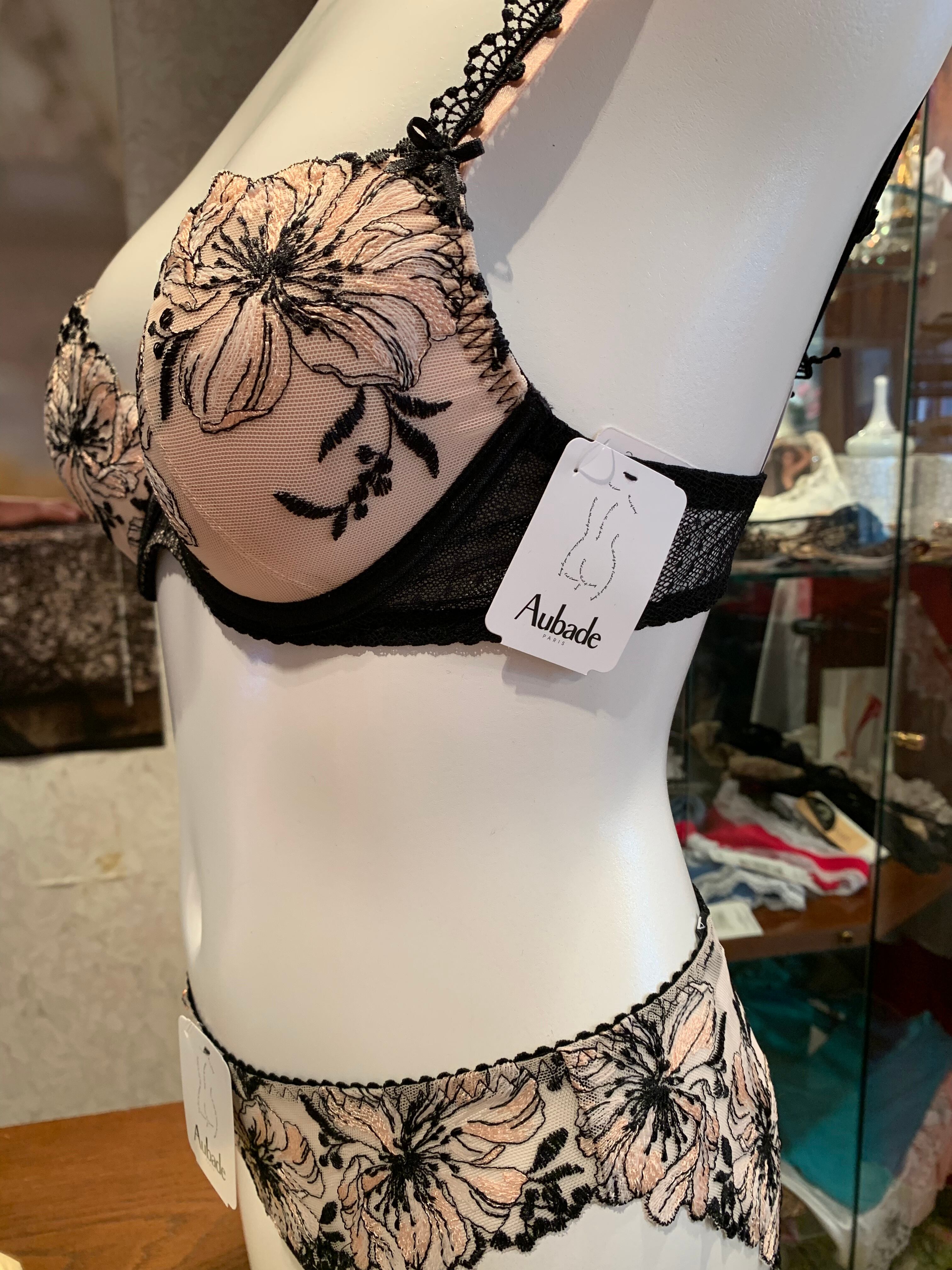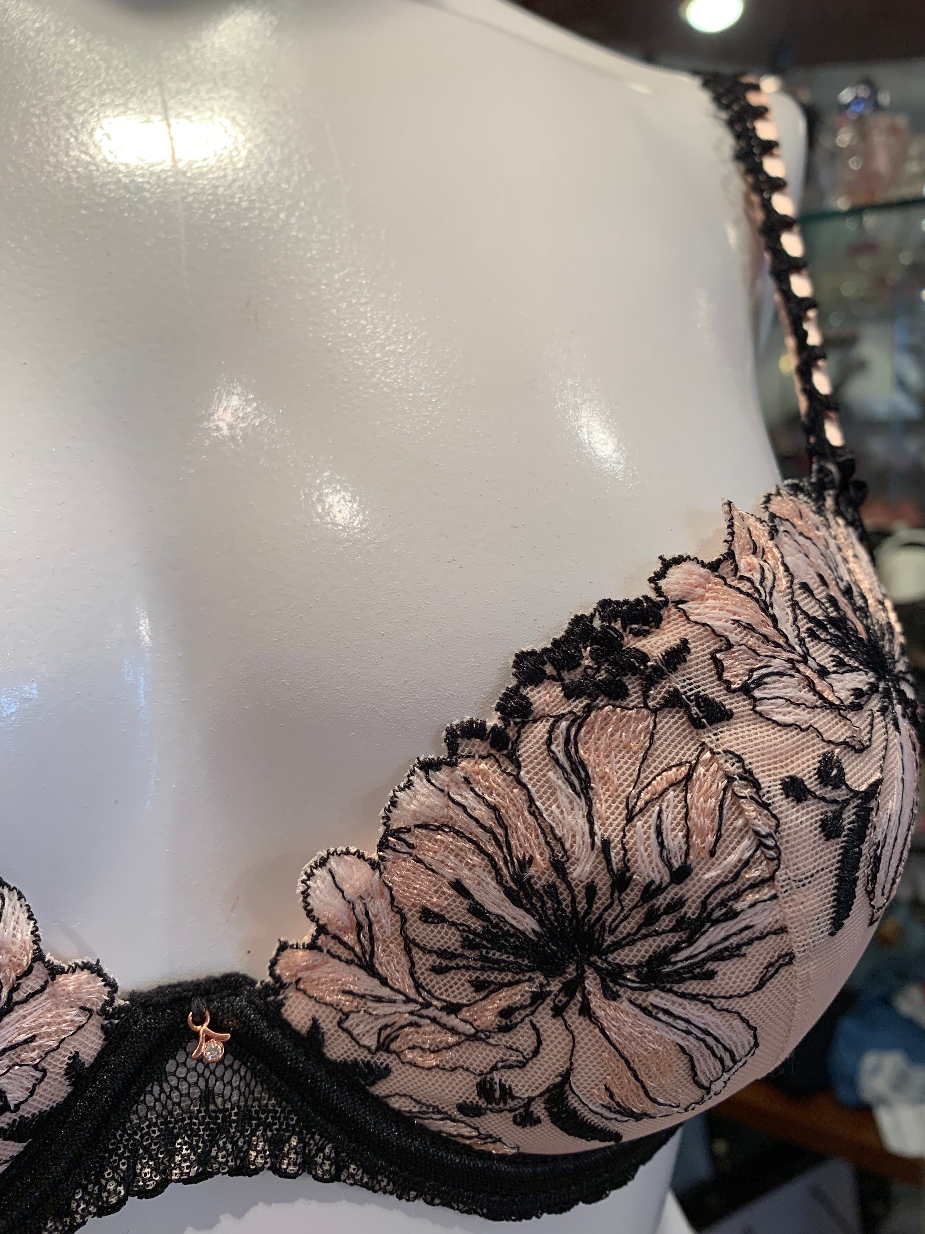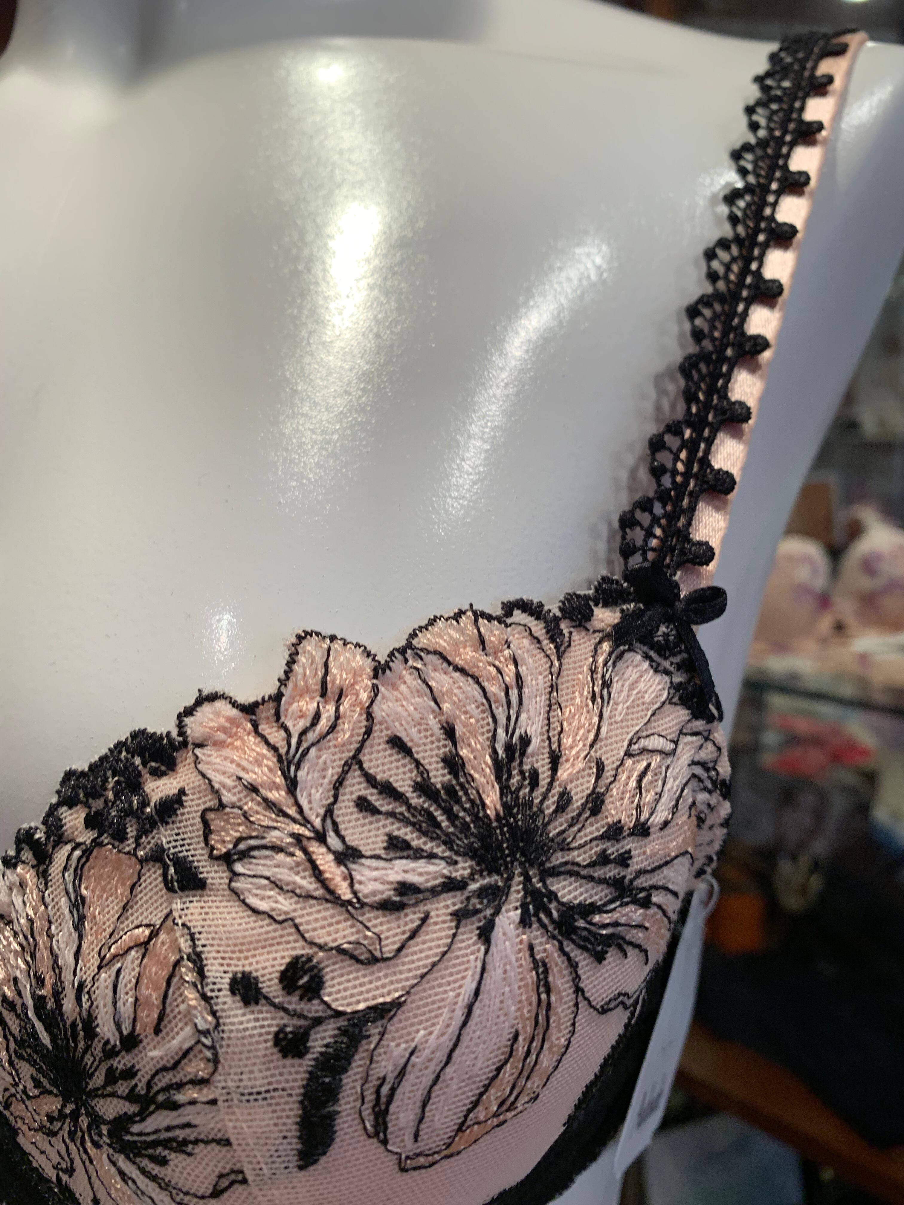 上品にうつろうパウダーピンクをブラックで縁取る刺繍が、フラワーデティールを描き出すブラックベースです。