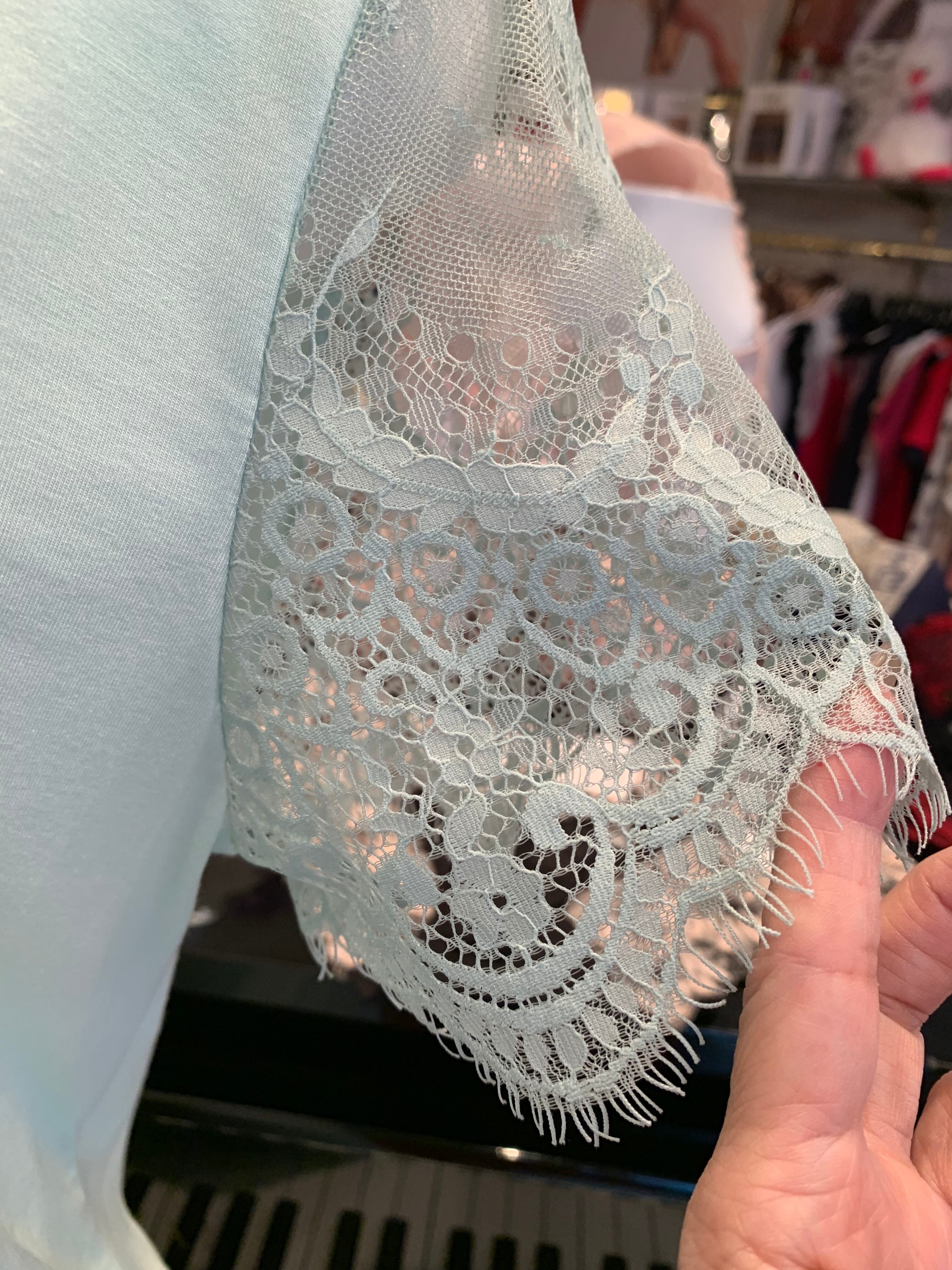 ネックラインにはマザーオブパールのボタンが付いた短いボタンの前立てがあり、半袖はレースで作られています。