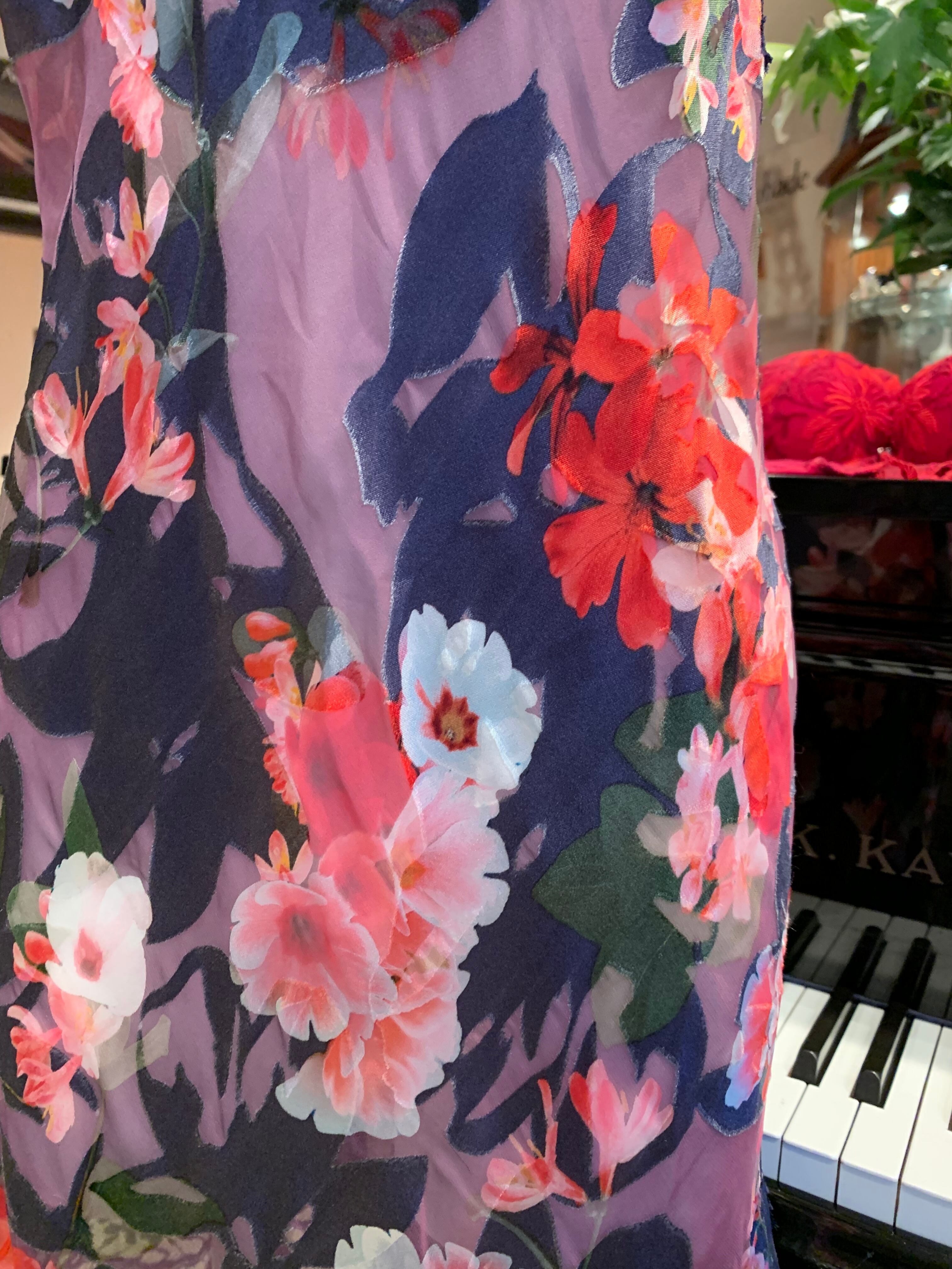 パープルがかったニュアンスのあるグレーベースの上でカラフルな花が明るく魅力的に踊ります。
