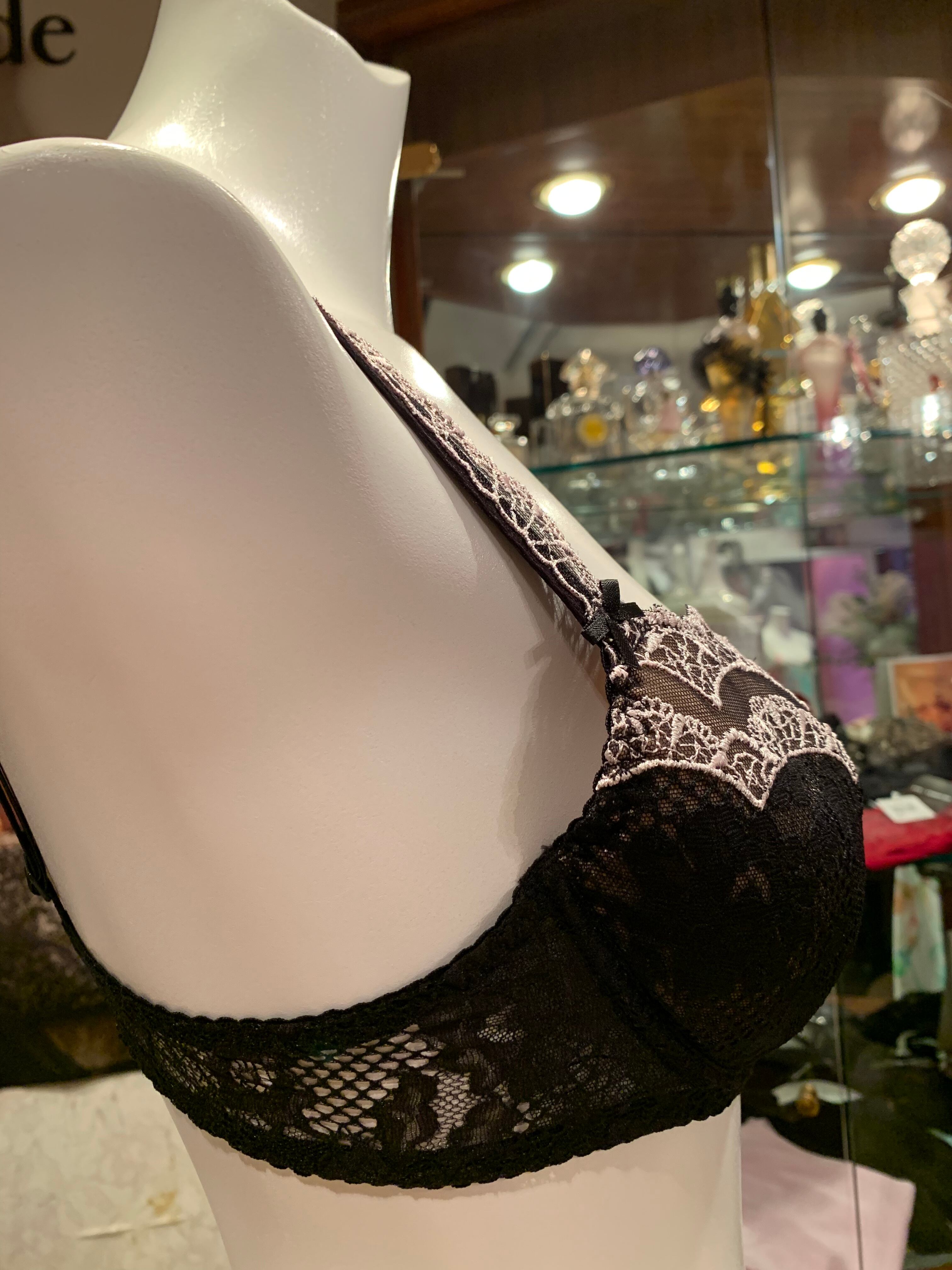 ブラックのレースと、ほのかに光るペールピンクの刺繍が演じる絶妙なコントラストに、シルバーのルレックス糸がアクセントを加えます。