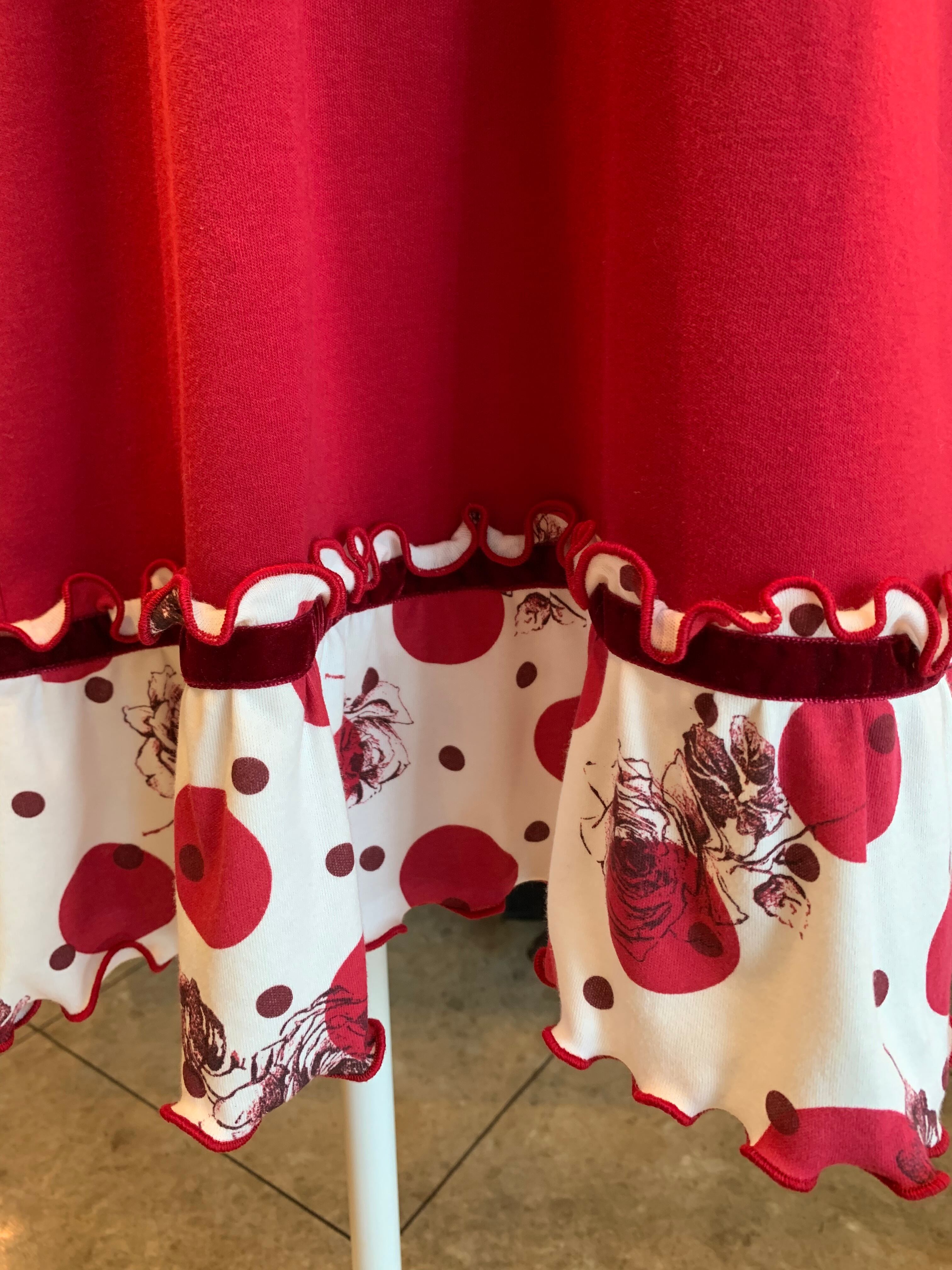 真っ赤が可愛いナイティ。裾のフリルやリボンテープにベロアを使ったりキュートデザインだけでは無く、裏生地には少し起毛しておりお肌触りもソフトですし暖かさを増します。