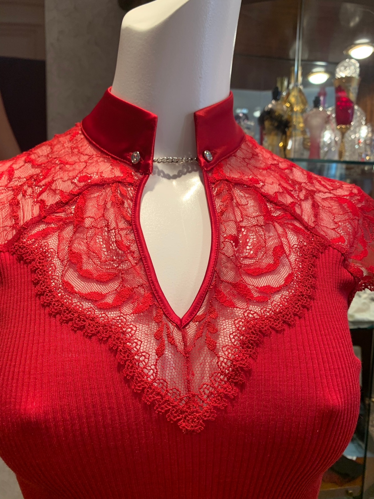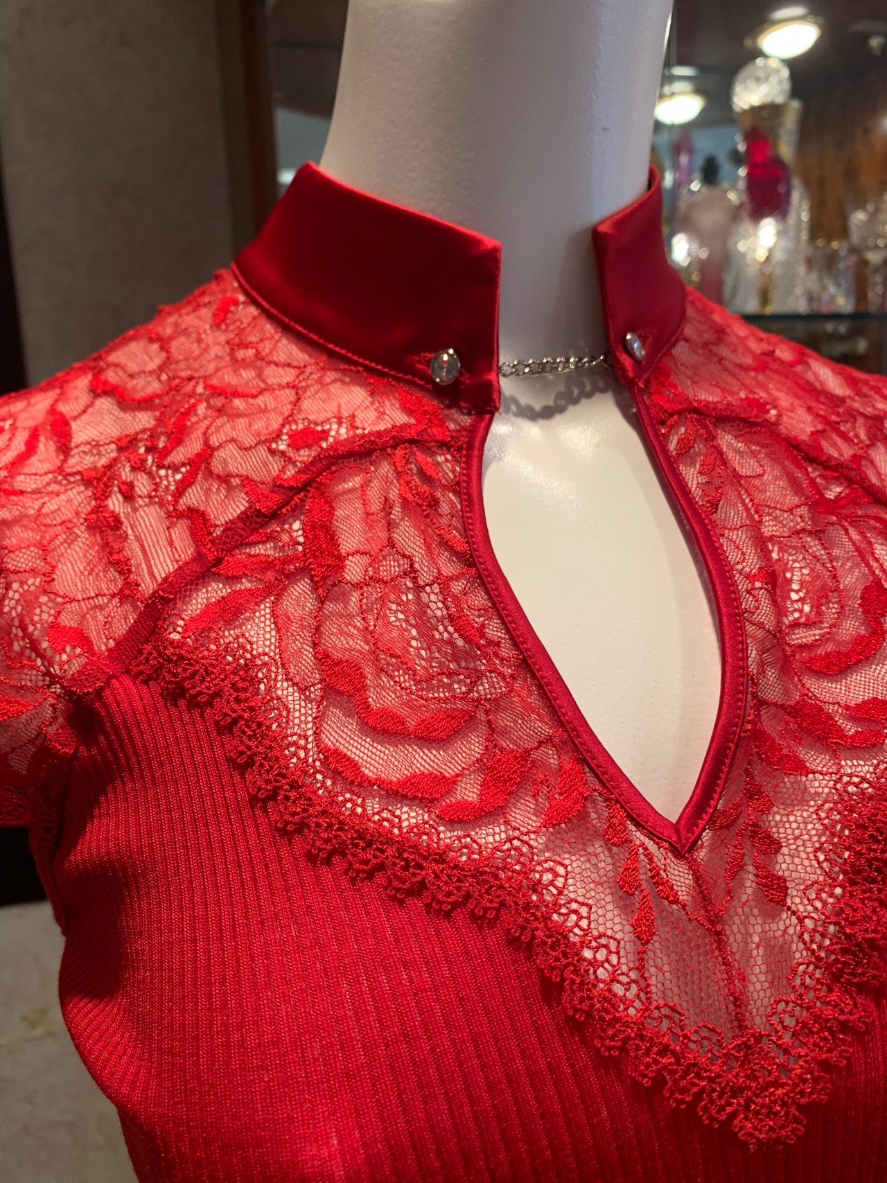 胸元に沿う高いカッティングの技術でサテンを使っています。