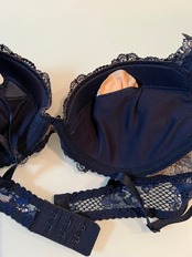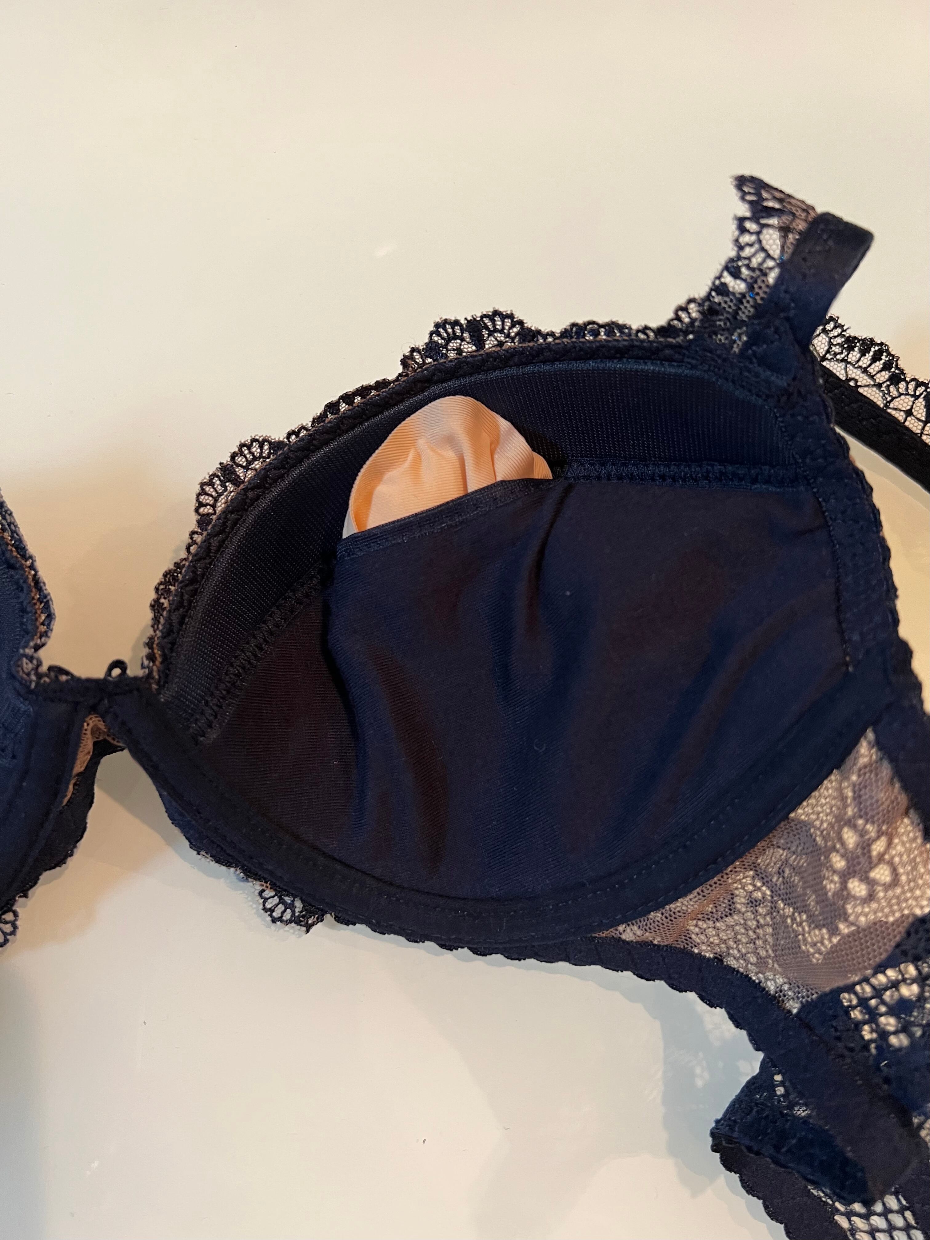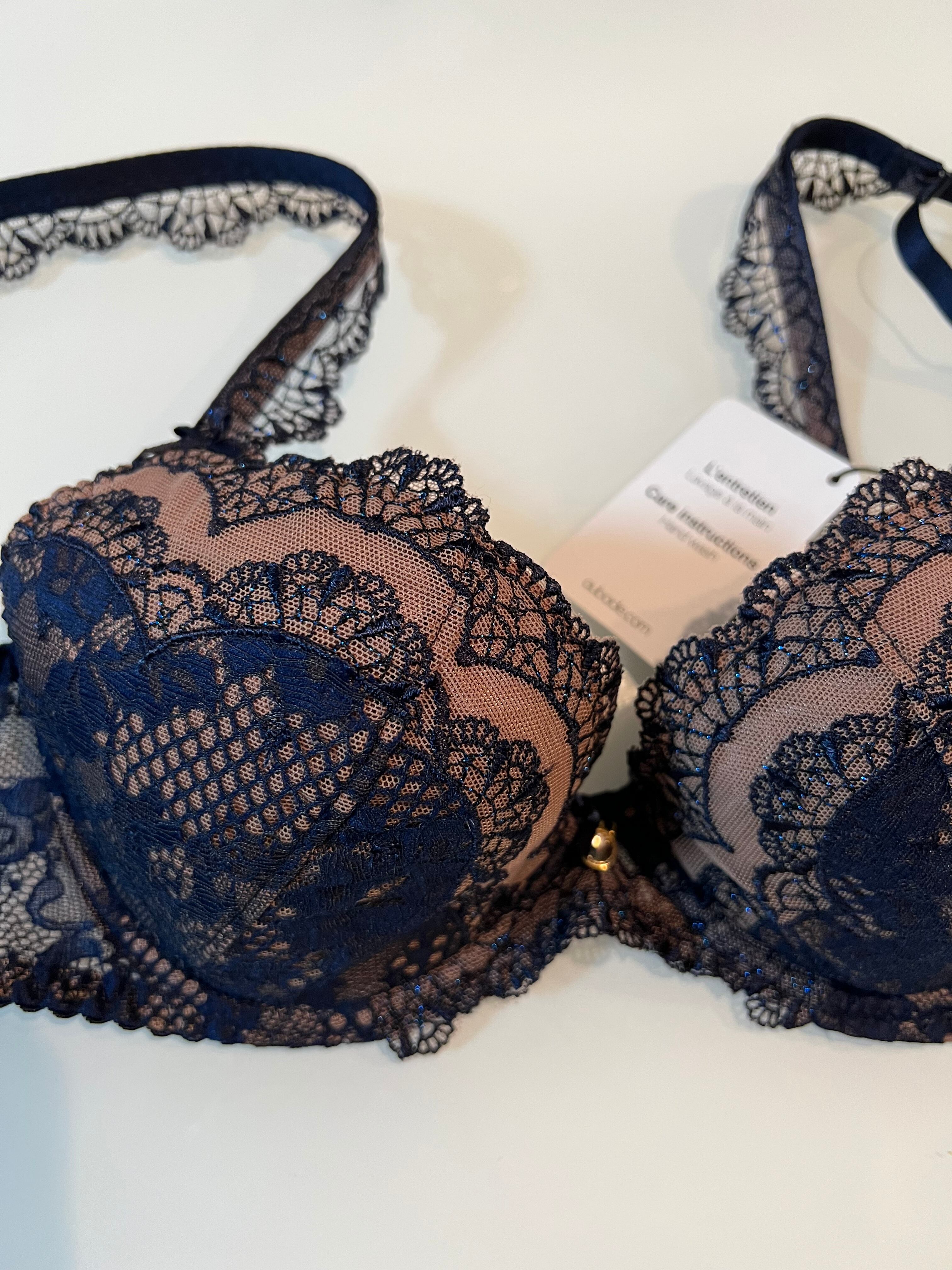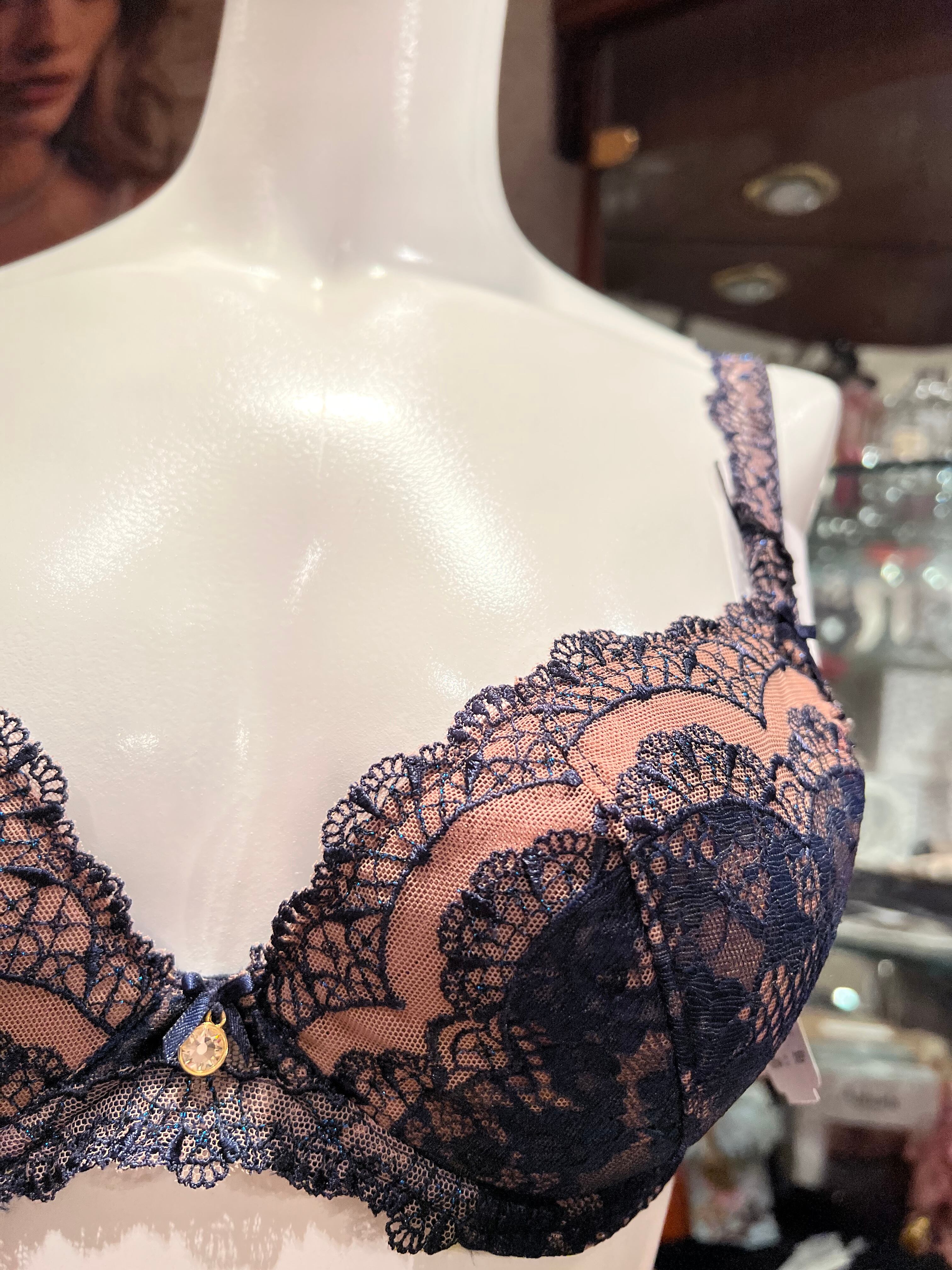 深くセクシーな谷間を作るダブルパデッドブラ。 上品なスキントーンのチュール地に、センシュアルなミッドナイトブルーの刺繍とレースが魅惑的。取り外し可能なビーズパッドが入ったカップは、裏地がコットン素材。肌当たりの良さも人気です。
