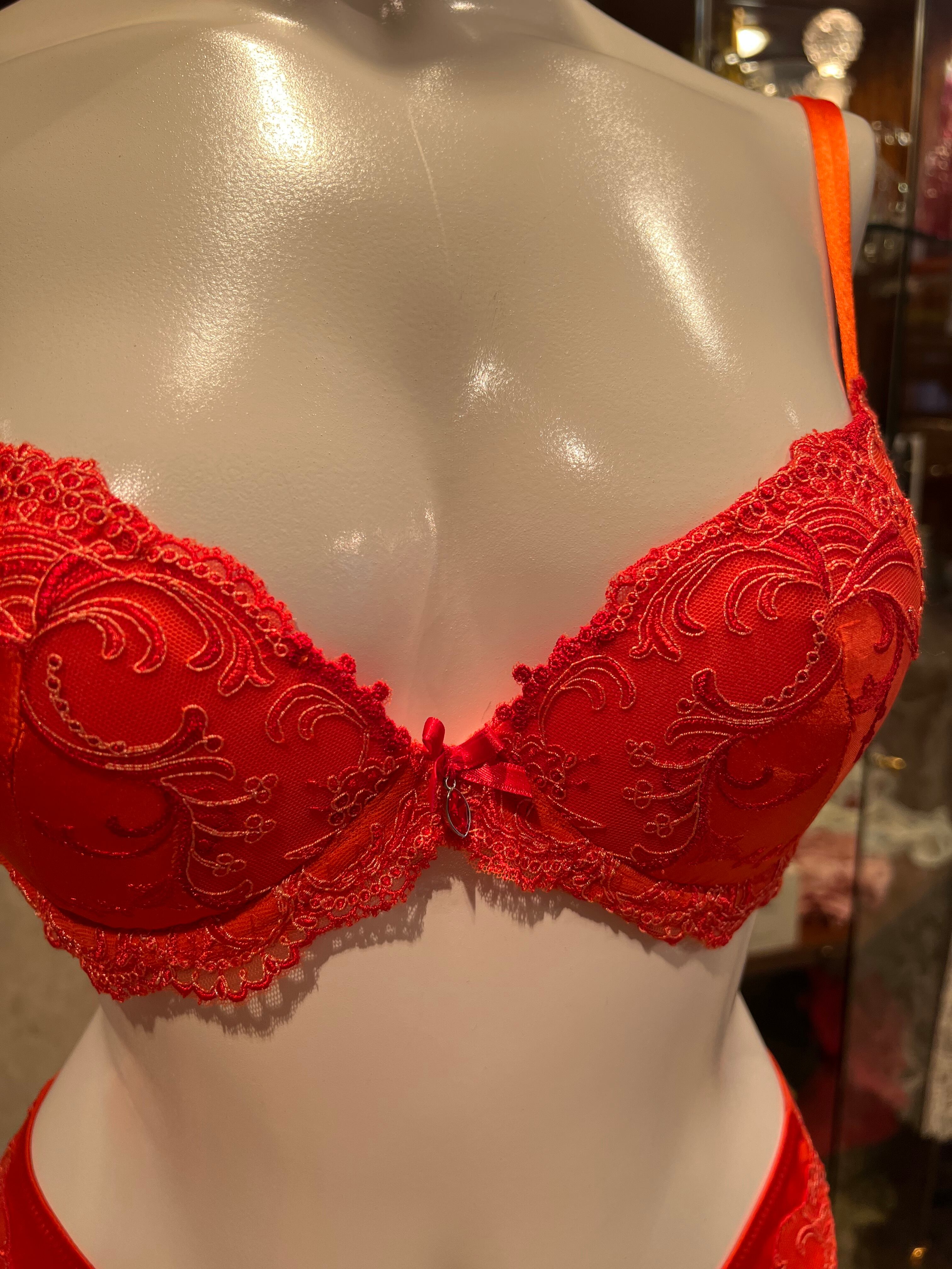 ♡ワイヤー入りのモールドパッドブラ。A,Bカップは厚底プッシュアップタイプ。ふっくら丸みを帯びたシルエットを作ります。シルクサテン地の美しい艶にモチーフのレース。深いオレンジのシンプルな肩紐は見えても素敵です。