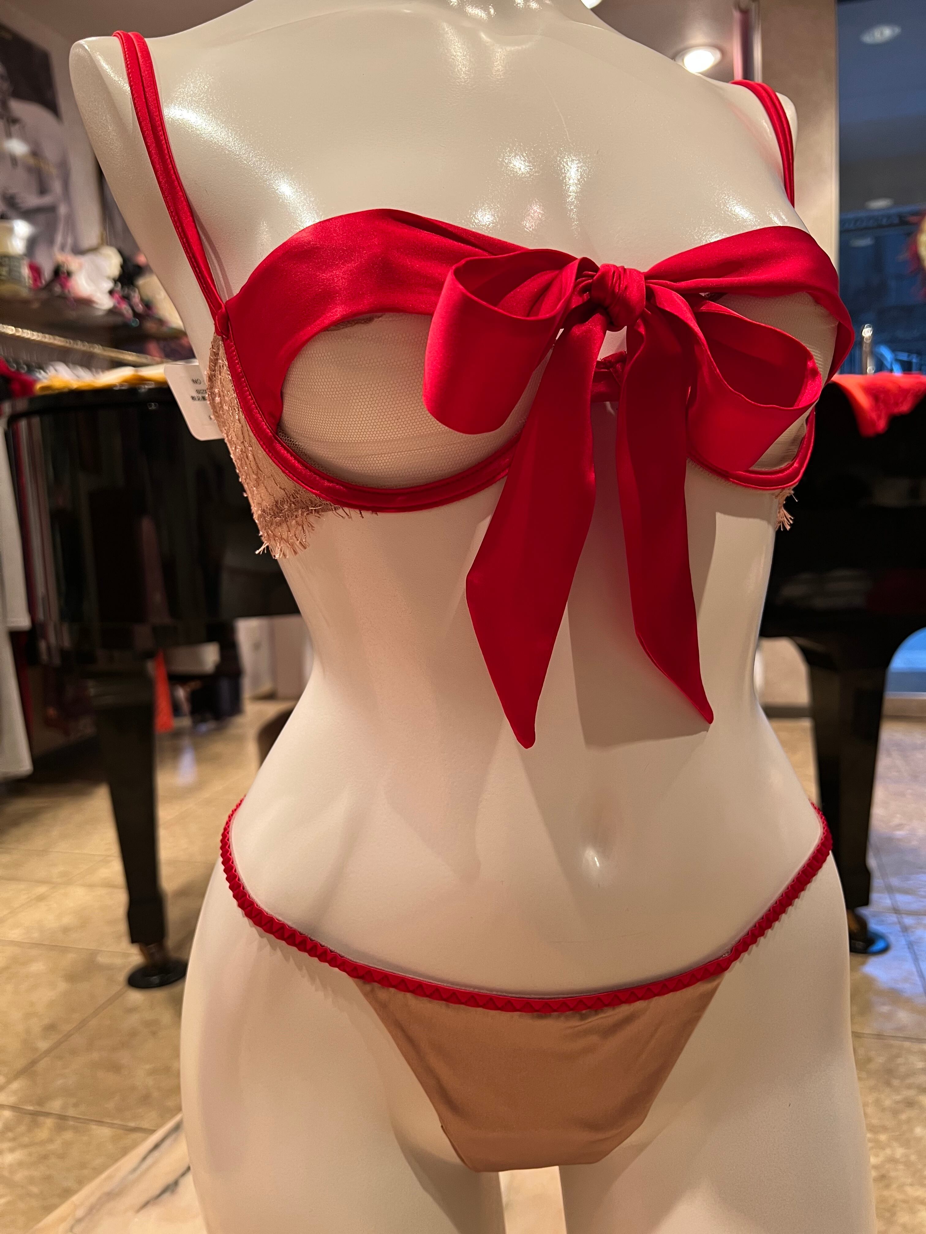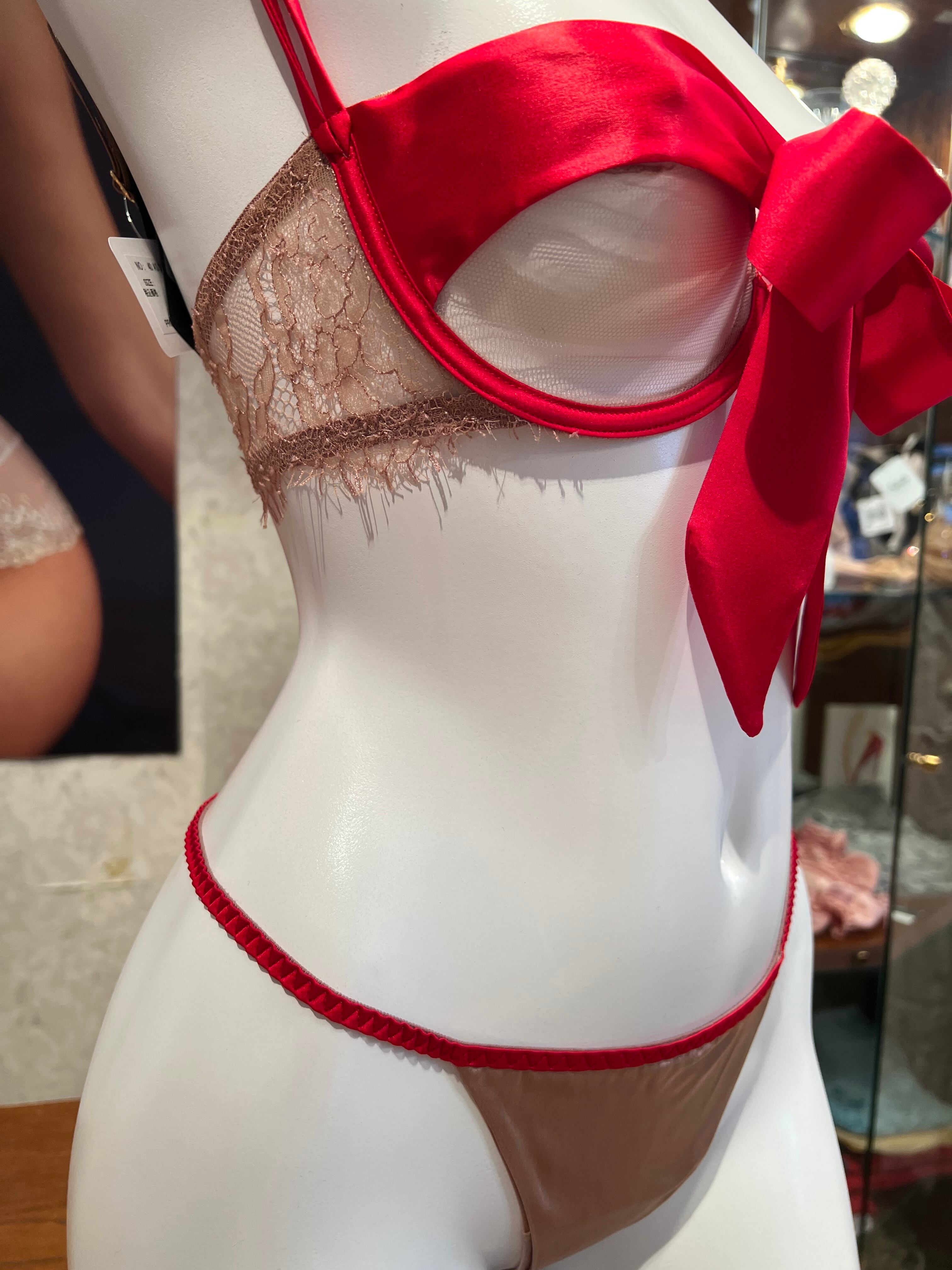 でもその下にきちんとハーフカップのチュールとワイヤーでバストの形はホールド致します。真紅のシルクとブラウン系の落ち着いたチュールカラーで上品にパッションを放ちます。ショーツとブラのサイドラインのレースは目を見張る美しさです。