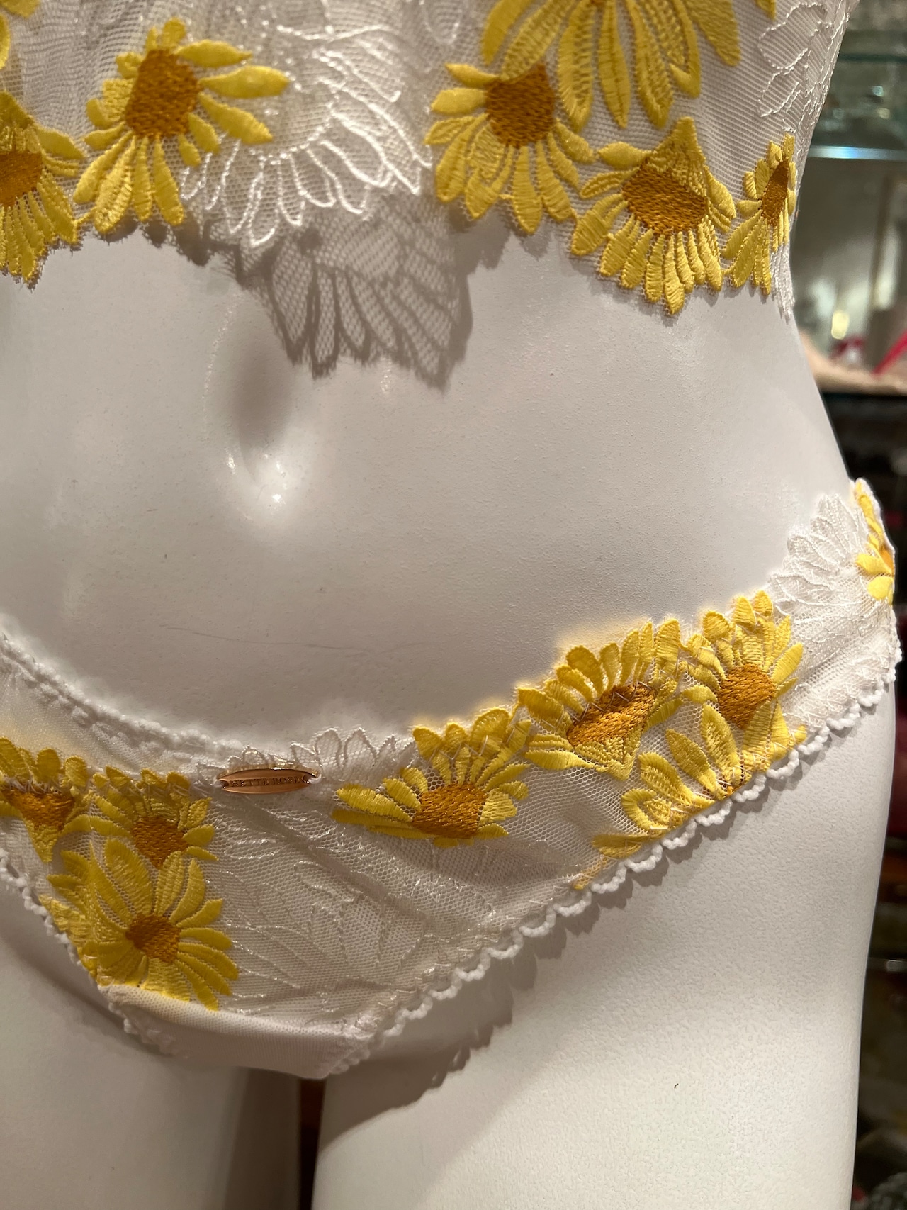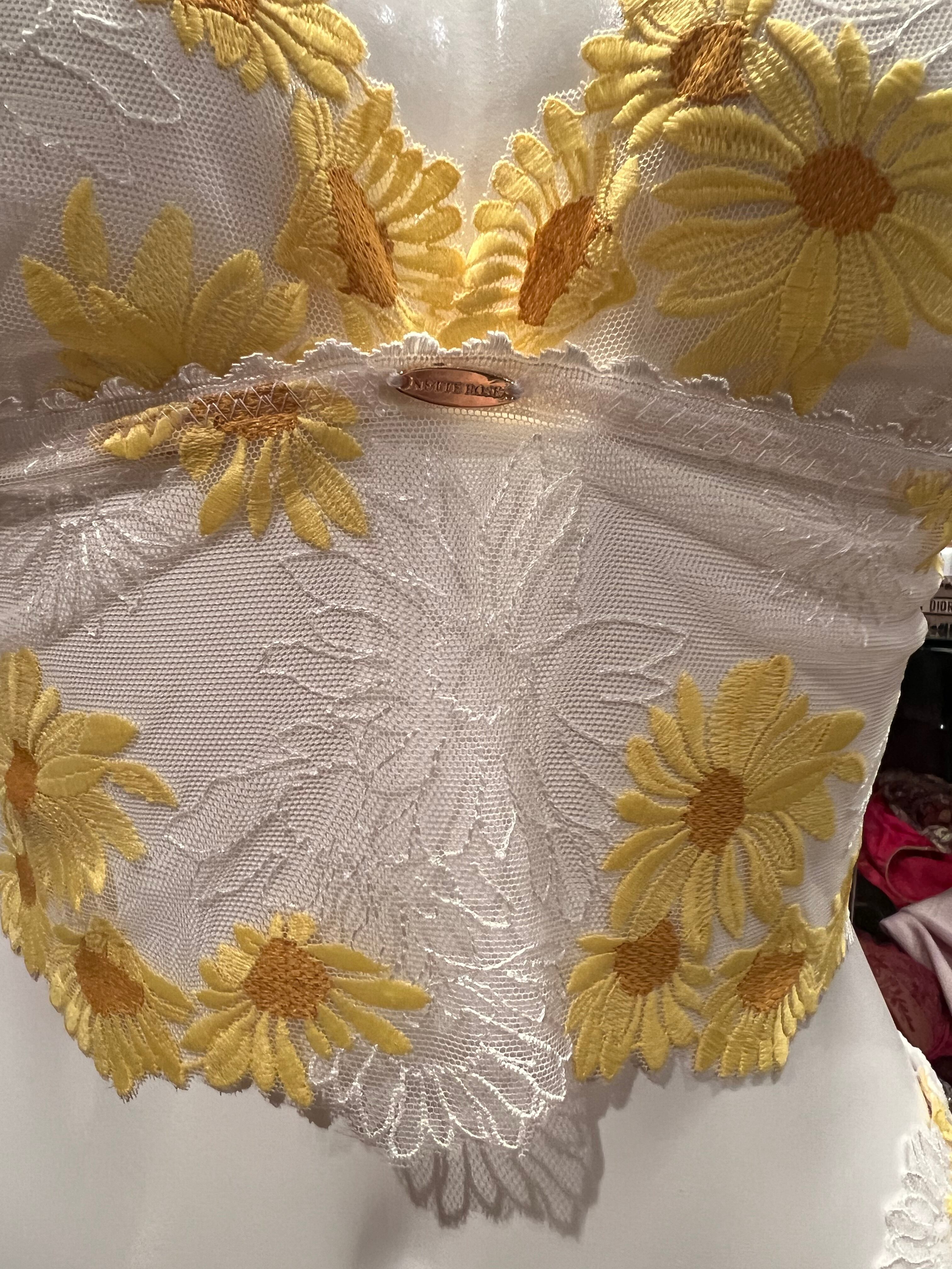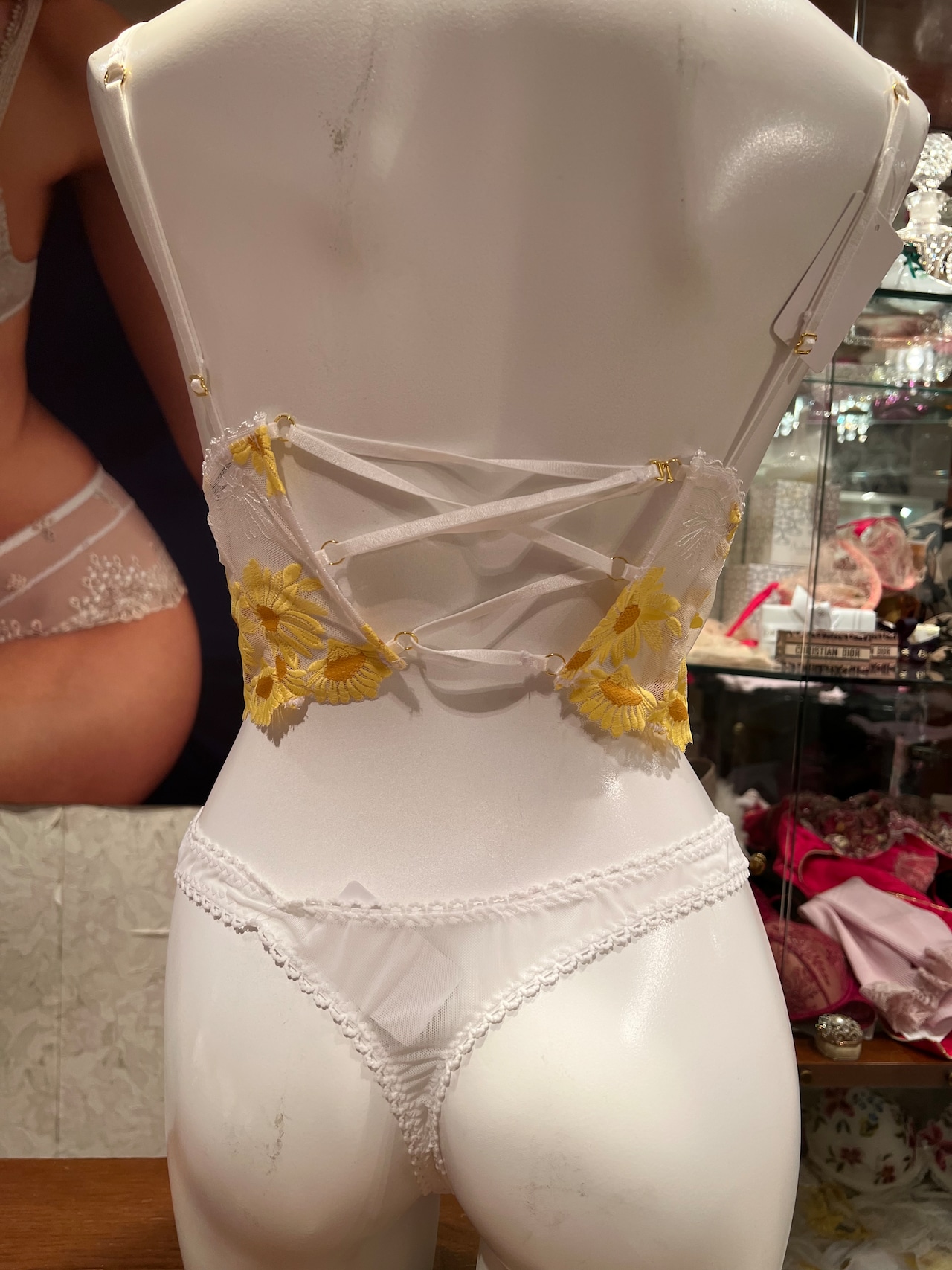 とても丁寧な刺繍ですが繊細で重たくならず柔らかい肌触りです。パテッド無しワイヤー無しのブラレットタイプです。 バックスタイルのクロスがおしゃれでアンダーの調節も出来るようになっています。ご自分のぴったりな感じにできます。ボトムはキュートにタンガと合わせてみました。