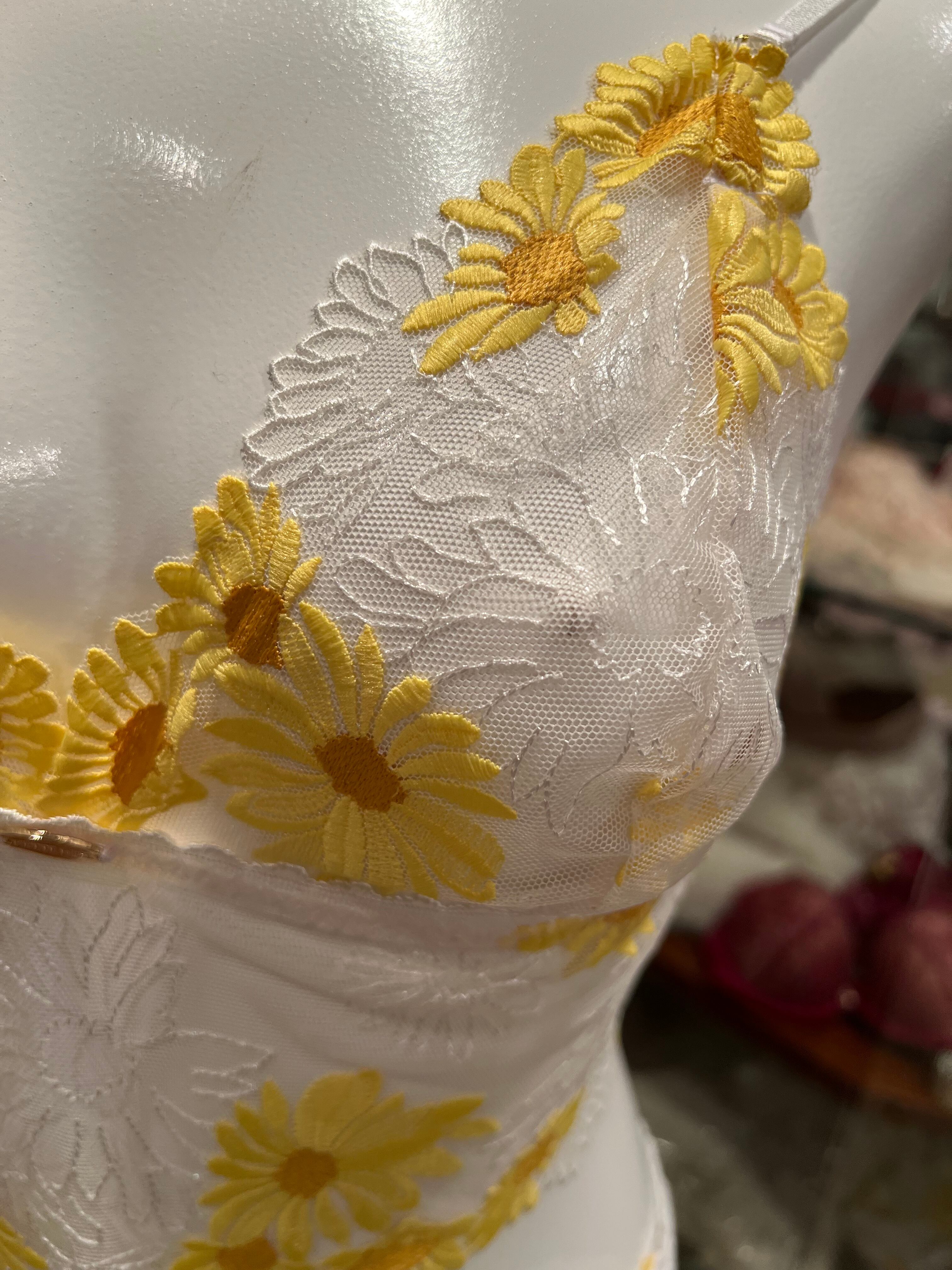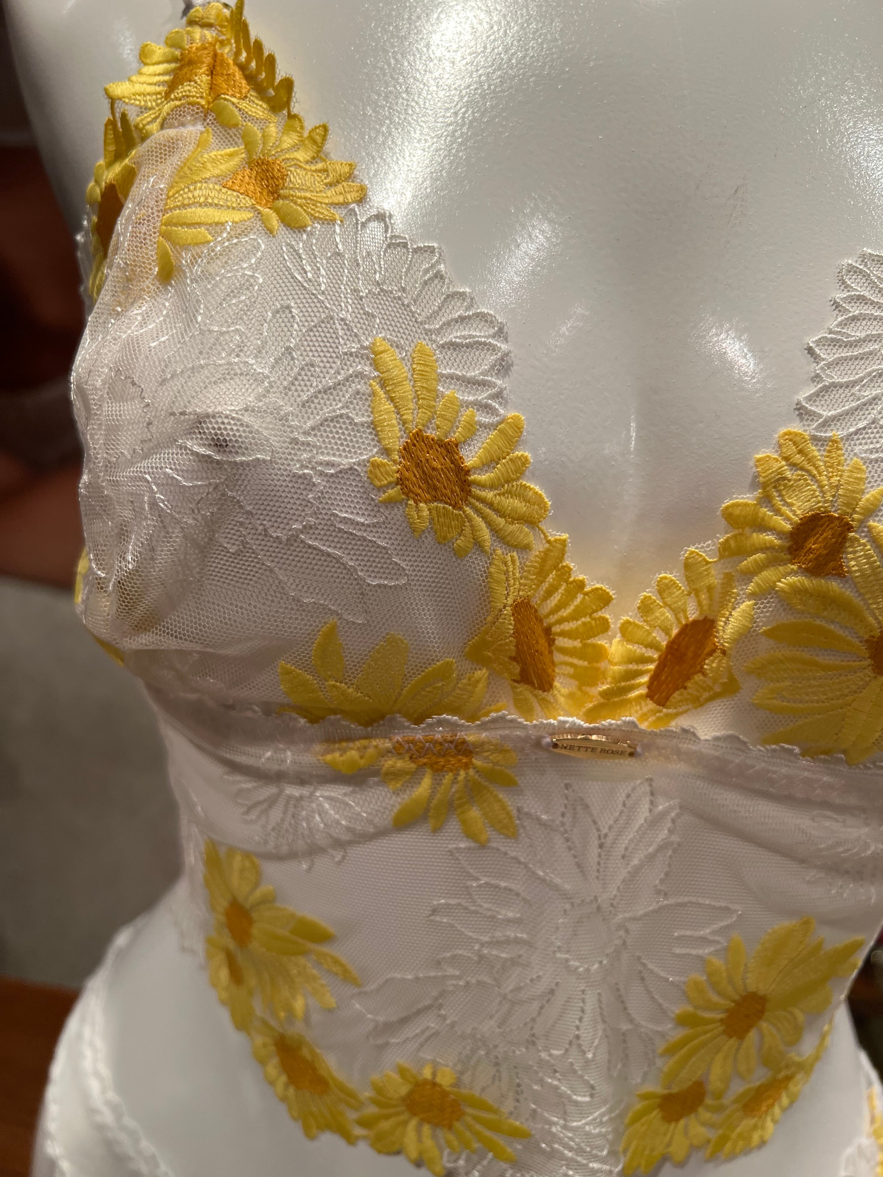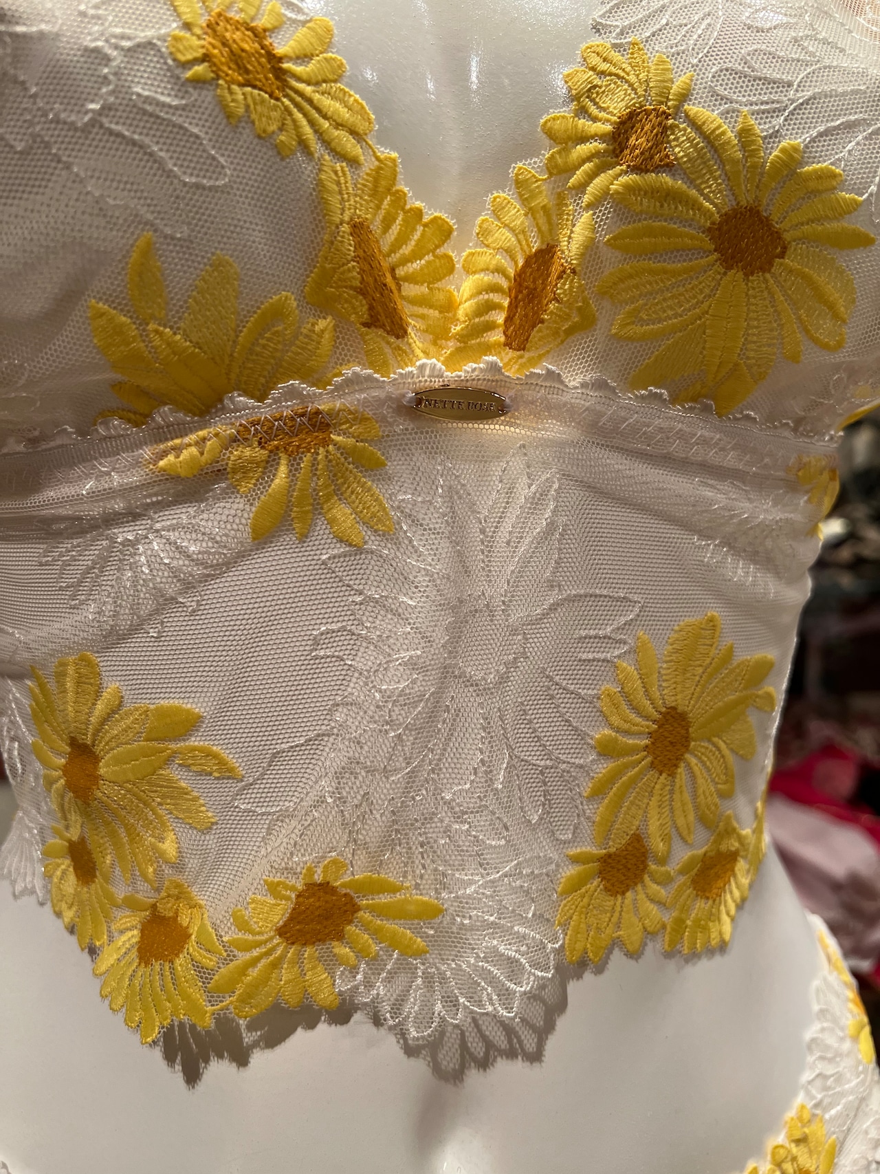 とても丁寧な刺繍ですが繊細で重たくならず柔らかい肌触りです。パテッド無しワイヤー無しのブラレットタイプです。 バックスタイルのクロスがおしゃれでアンダーの調節も出来るようになっています。ご自分のぴったりな感じにできます。ボトムはキュートにタンガと合わせてみました。
