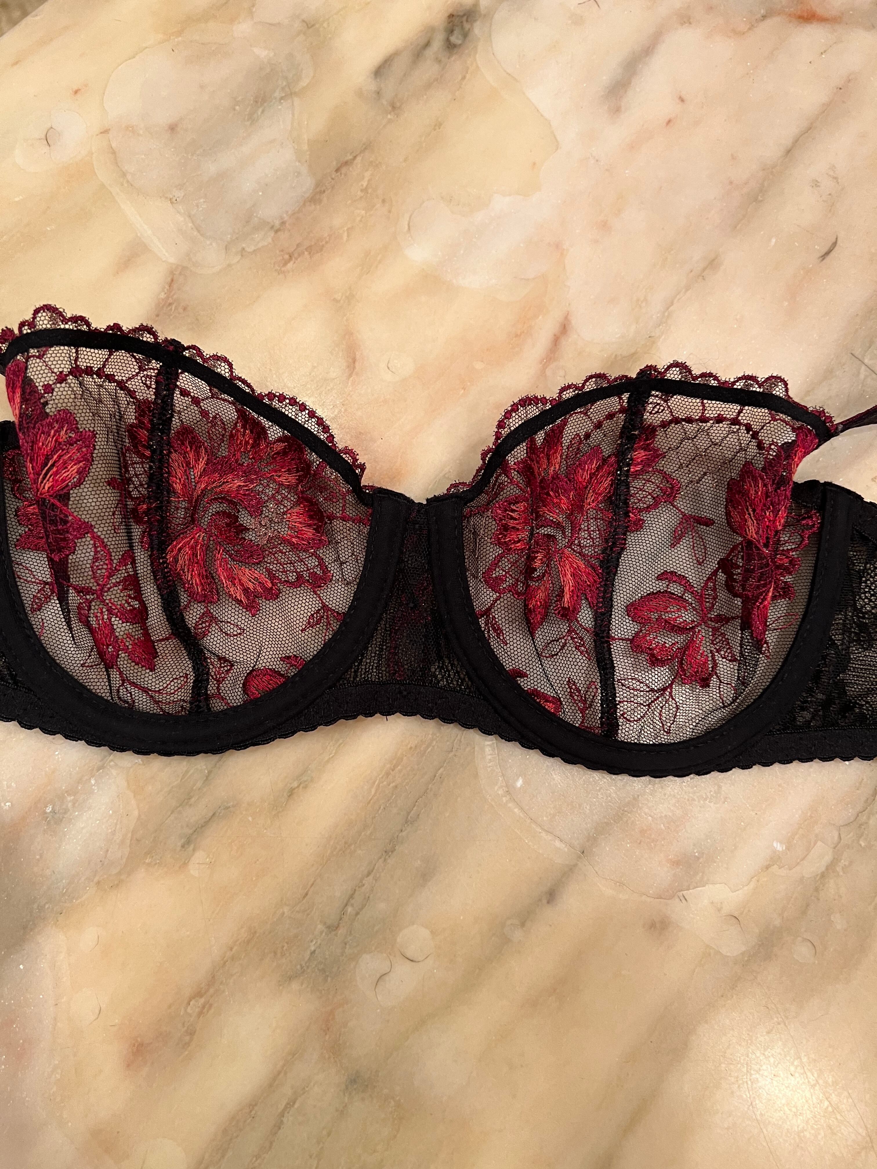 ♡フェミニンで繊細なハーフカップブラ。Aubade の特徴でもあるプッシュアップスタイルの最新バージョンでバストを持ち上げ、セクシーな谷間わ、作り出します。黒のベースに情熱的な赤の刺繍が施されストラップとカップの間には煌めくディテールがアクセントを添えています。