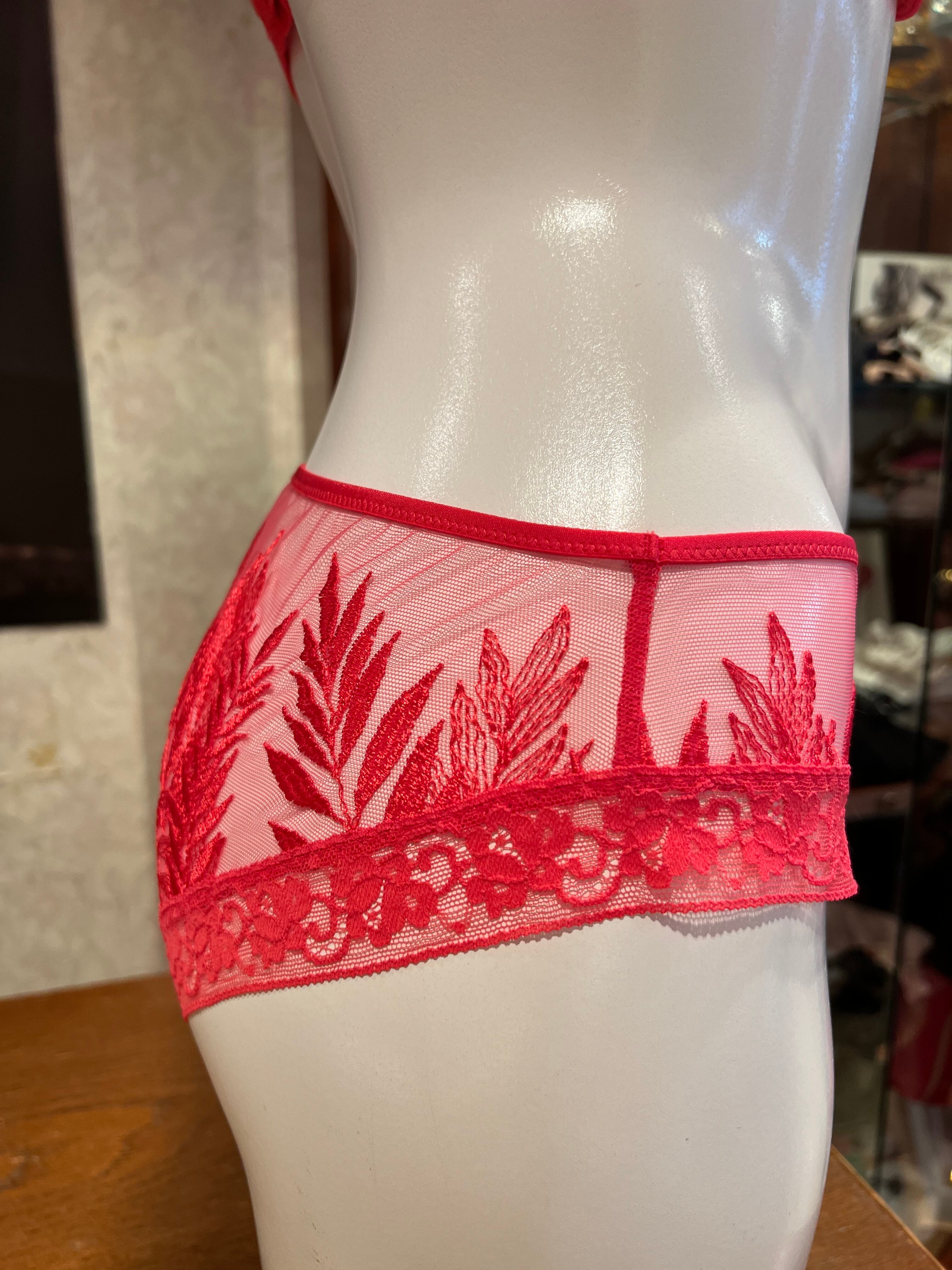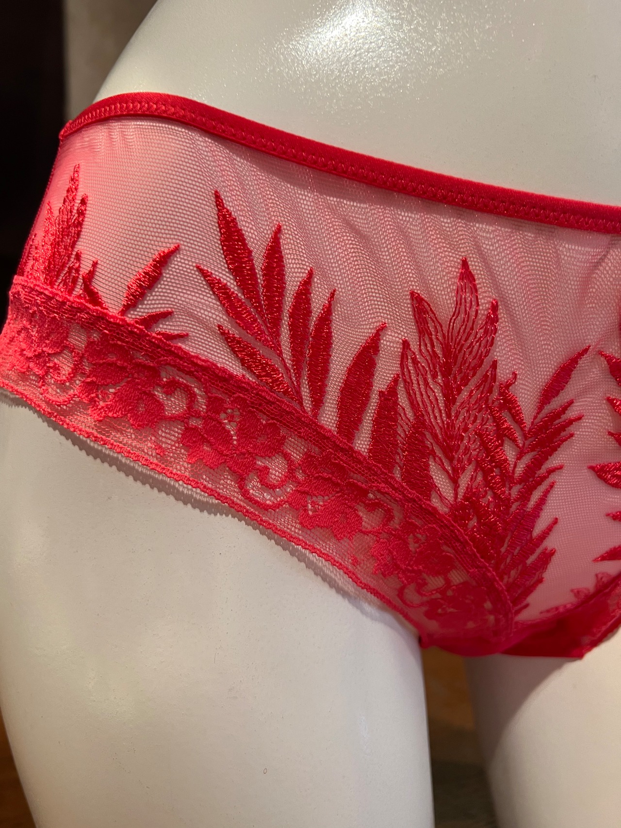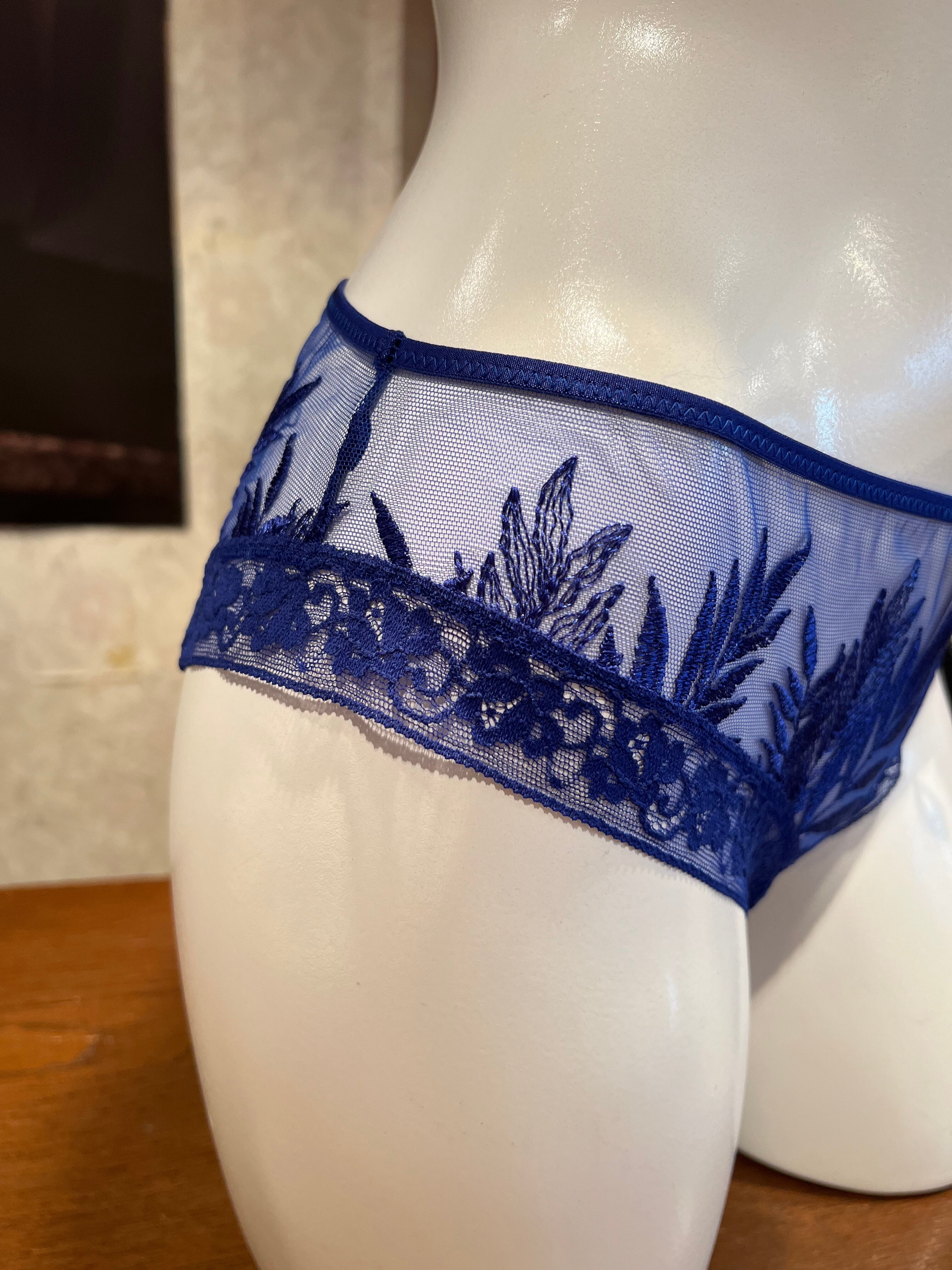 モダンでセクシーなヒップスター。コレクション独自のボタニカル刺繍をフロントとバックにあしらい、シースルーと不透明な素材のコントラストを表現しています。お尻をきれいに見せるためにサイドは広く、バックはゆ高めにカットされ、脚の上部には上品で魅惑的なフラワーレースのバンドがあしらわれています。一日中身に着けても快適で、夜はTシャツと合わせて官能的で冒険的なルックを楽しめます。